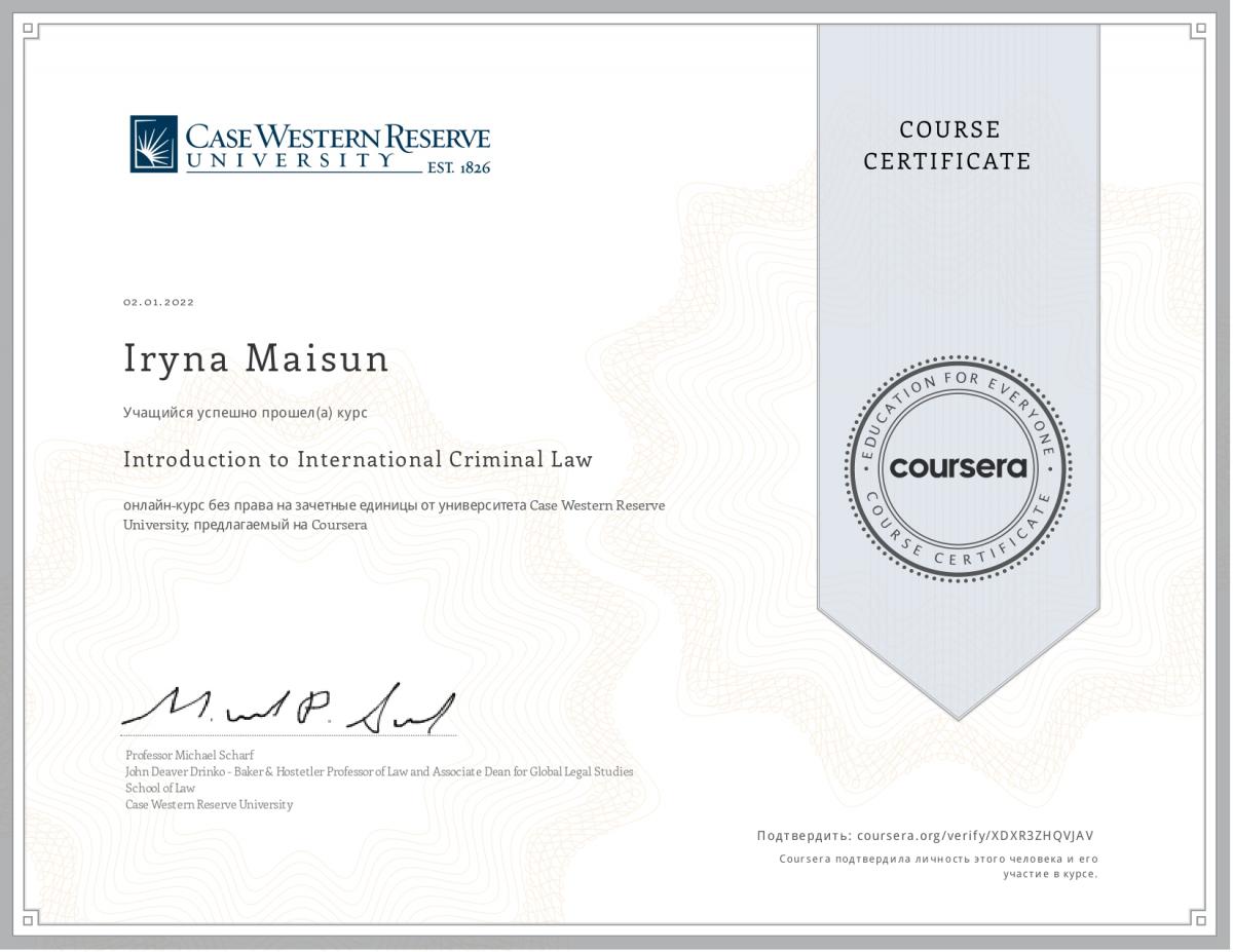 Iryna Maisun, a lecturer at the Department of Legal Disciplines of Sumy Branch of KhNUIA, successfully completed an eight-week course "Introduction to International Criminal Law" from Case Western Reserve University. The course was taught by one of the world's leading experts in this field - Michael Scharf.