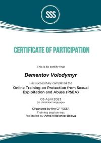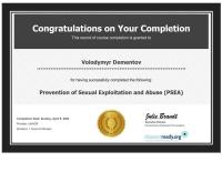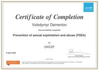Volodymyr Dementov, Associate Professor of the Department of Socio-Economic Disciplines of Sumy Branch of KhNUIA, PhD in Public Administration, has successfully completed several online courses on Prevention of Sexual Exploitation and Abuse (PSEA).