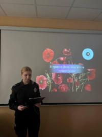 An informational and educational hour dedicated to the Day of Remembrance and Reconciliation and the Day of Victory over Nazism in World War II of 1939-1945 was organized and held for the 1st year cadets of Sumy Branch of Kharkiv National University of Internal Affairs. 1st year cadet Anhelina Pravdiuk acquainted the students with the information material of the Ukrainian Institute of National Memory.