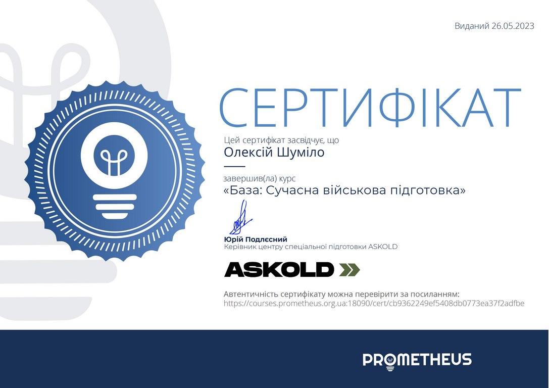 Professor of the Department of Legal Disciplines of Sumy Branch of Kharkiv National University of Internal Affairs Oleksii Shumilo has successfully completed his professional development by taking the training course "Base: Modern Military Training" on the Prometheus educational platform. The course was developed by the ASKOLD Specialized Training Center.