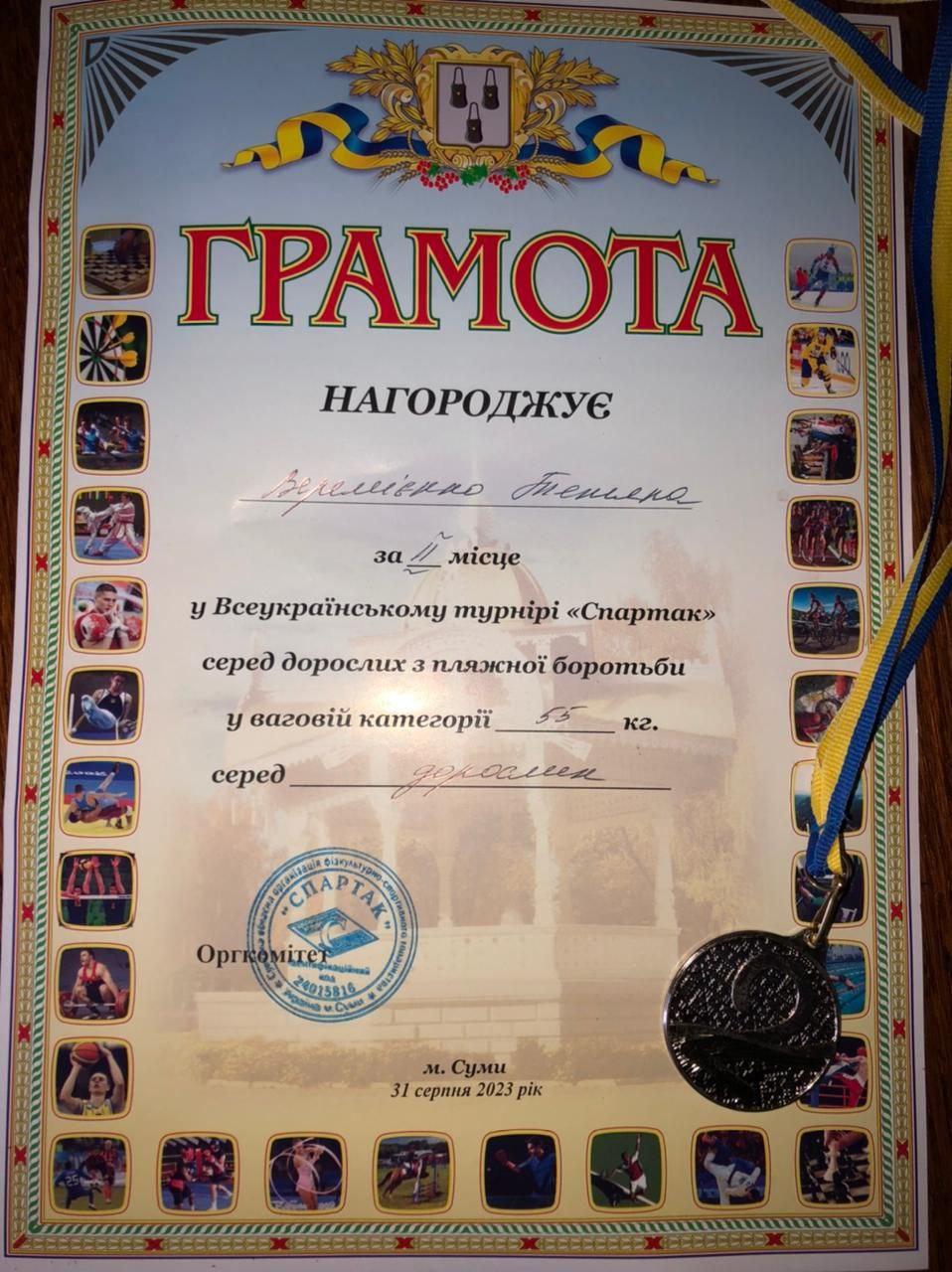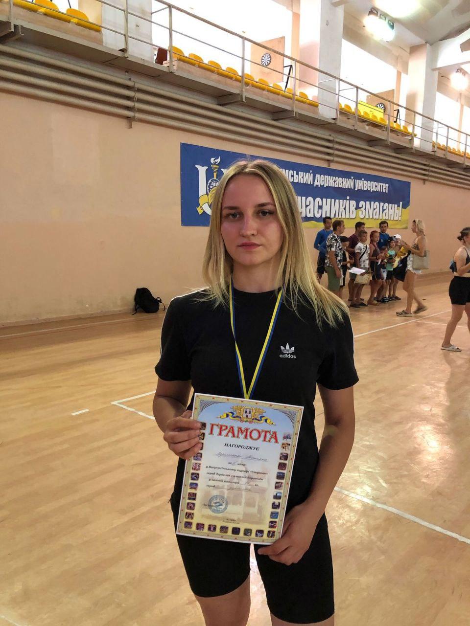 The 3rd year cadet of Sumy branch of Kharkiv National University of Internal Affairs Tetiana Veremiienko took part in the city open beach wrestling championship dedicated to the memory of the Heroes of Ukraine who gave their lives for freedom and independence. According to the results of the competition, the cadet took second place in the 55 kg weight category among adults.