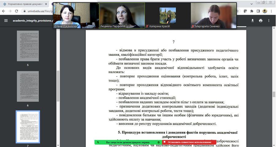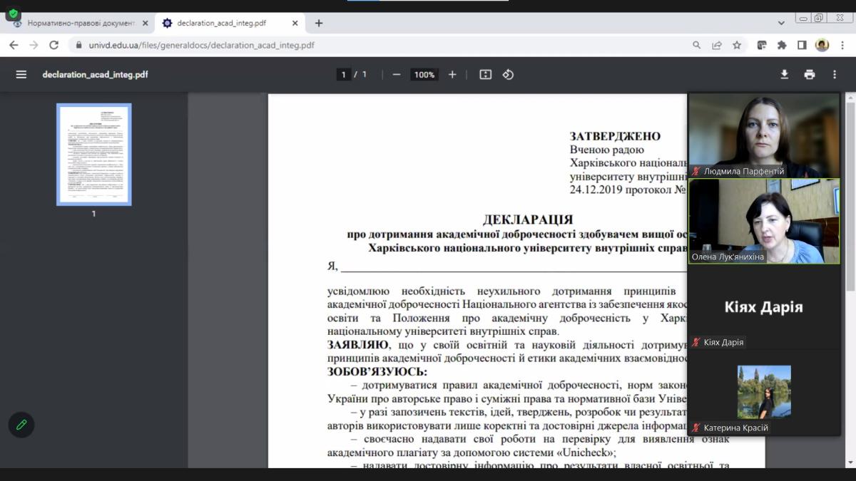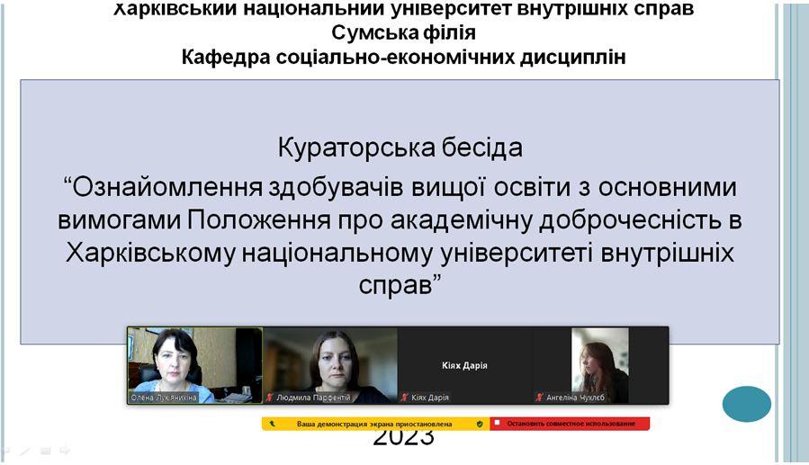 Olena Lukianykhina, Head of the Department of Socio-Economic Disciplines of Sumy Branch of KhNUIA, and Liudmyla Parfentii, Associate Professor of the Department, held a curatorial conversation "Familiarization of Higher Education Applicants with the Basic Requirements of the Regulations on Academic Integrity at Kharkiv National University of Internal Affairs" with first-year students majoring in Law.