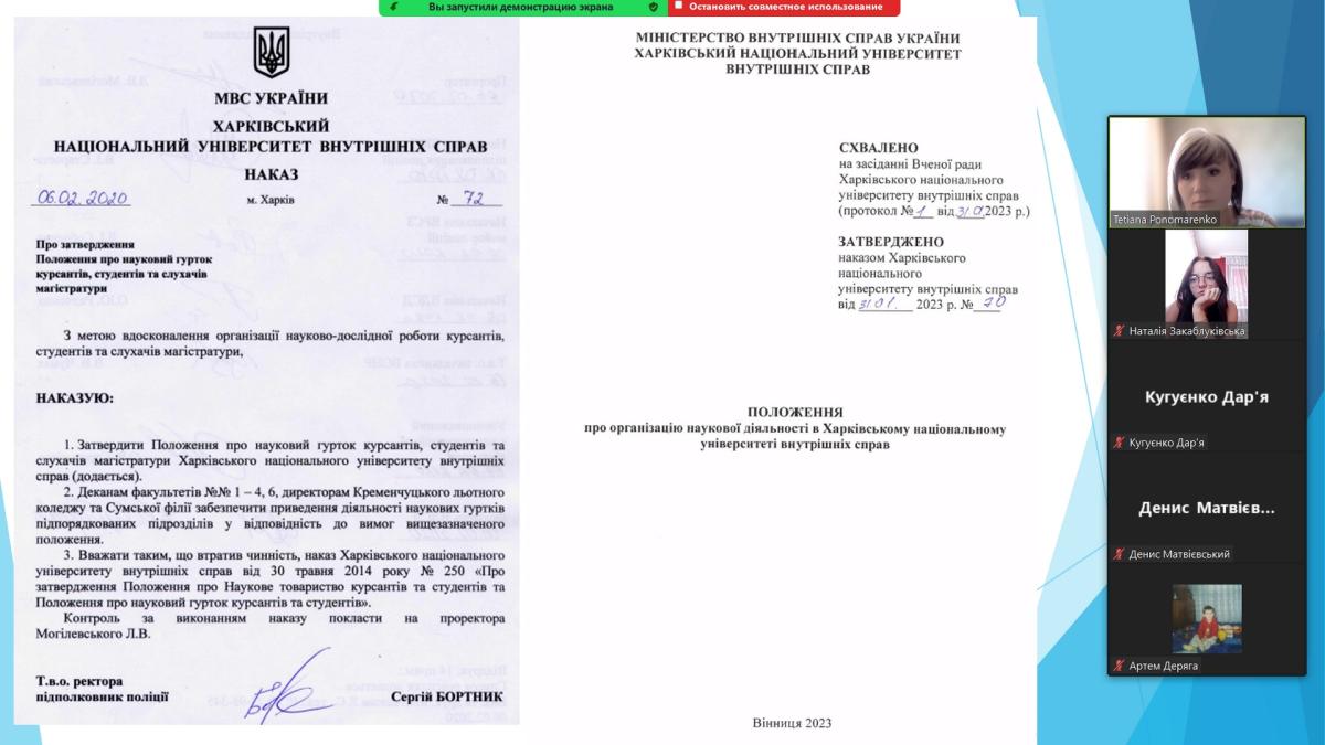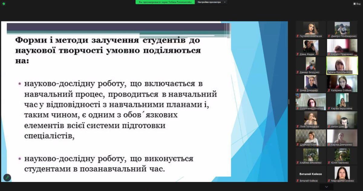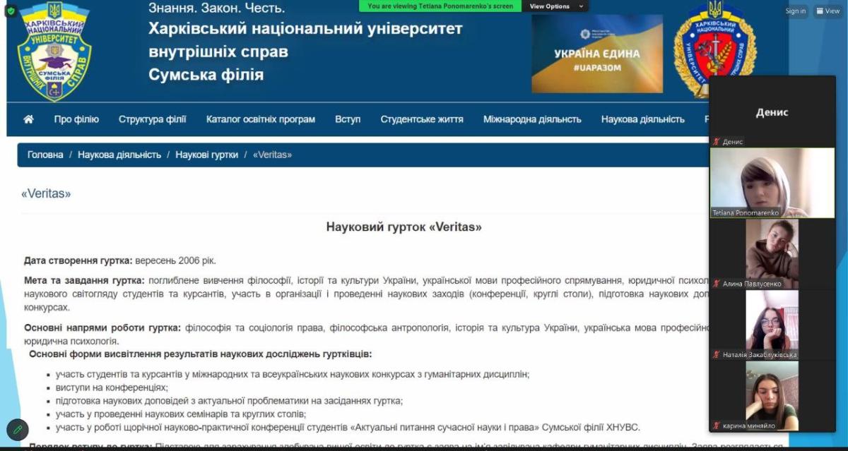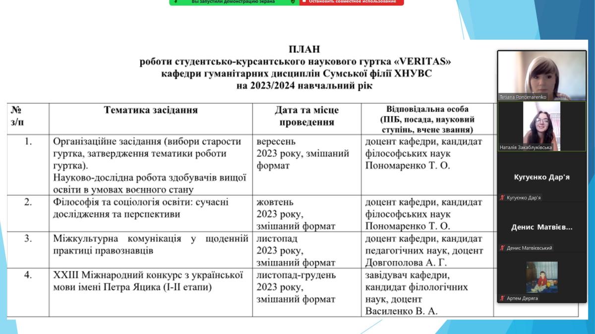 Research work of higher education applicants is one of the priority areas of work of the Department of Humanities of Sumy Branch of KhNUIA. The first organizational meeting of the scientific club "Veritas" was held, during which students considered the main issues on the agenda.