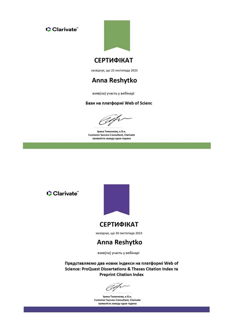 In order to familiarize themselves with the principles of work, presentation of scientific papers, citation indices, associate professors of the Department of Humanities of Sumy Branch of KhNUIA Yuliia Samoilova, Hanna Dovhopolova and senior lecturer Anna Reshytko took part in a series of webinars from Clarivate.