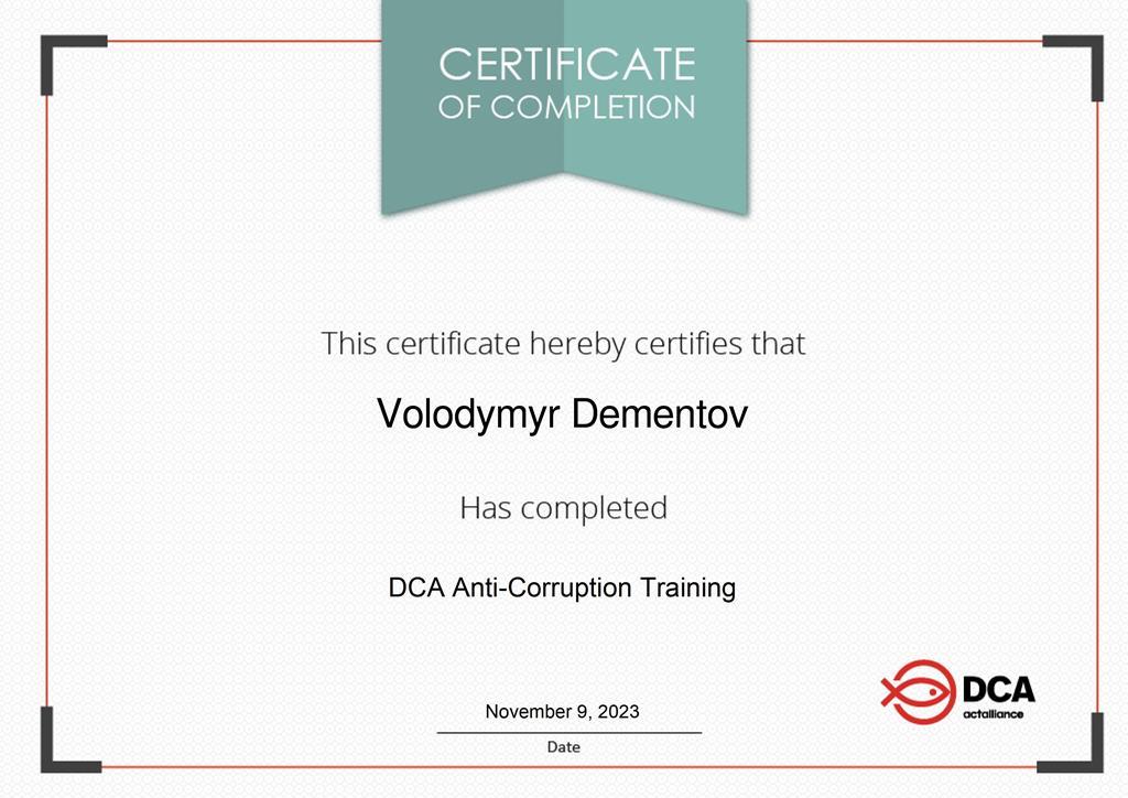 Volodymyr Dementov, Associate Professor of the Department of Socio-Economic Disciplines of Sumy Branch of KhNUIA, took part in the DCA Anti-Corruption Training and received a personal electronic certificate.