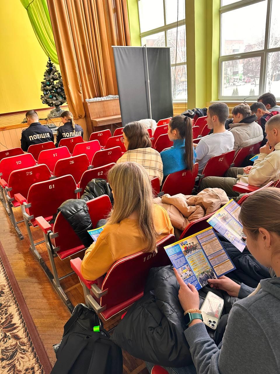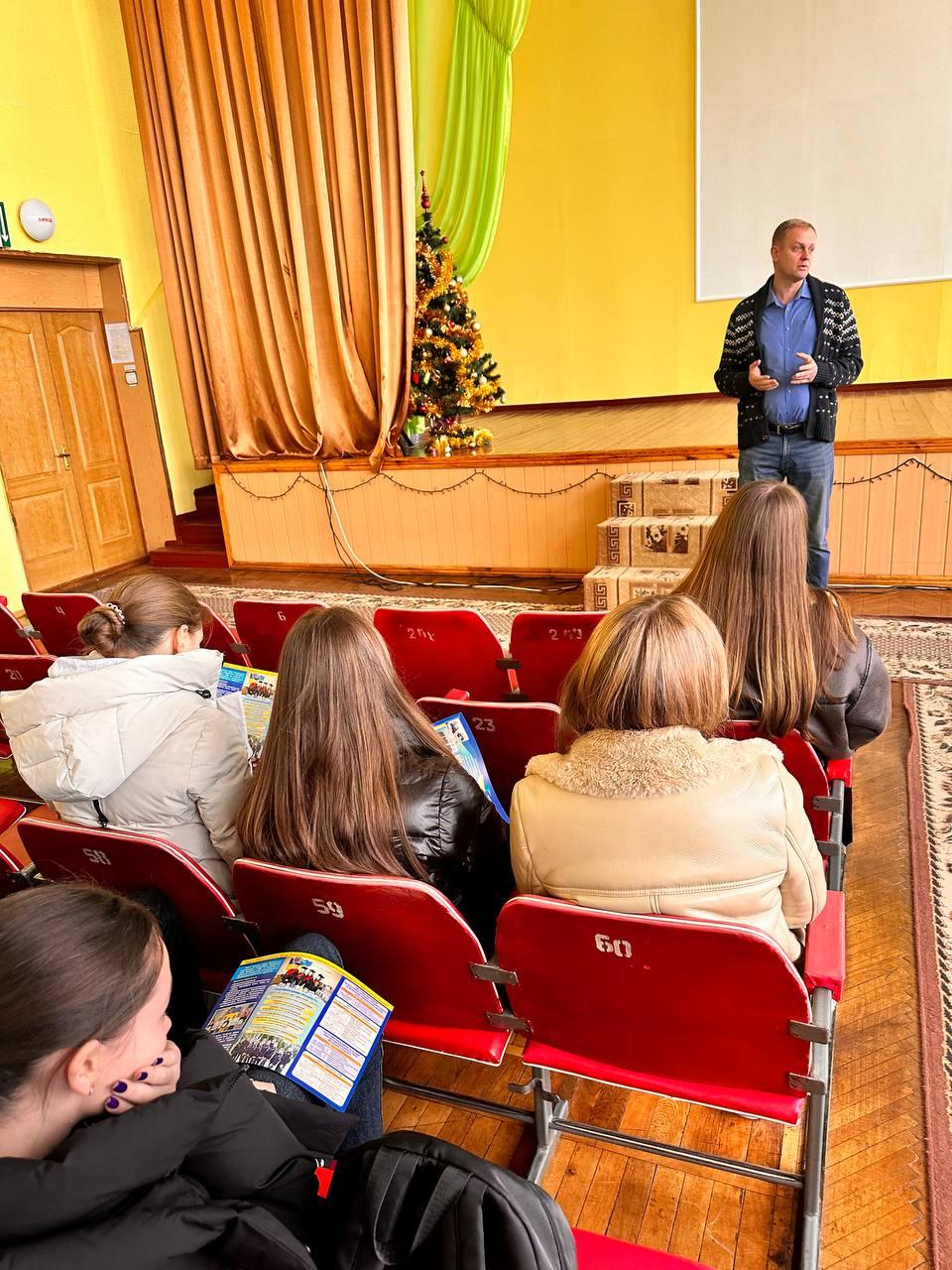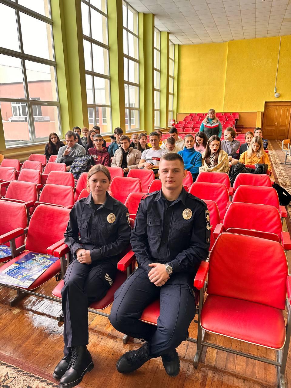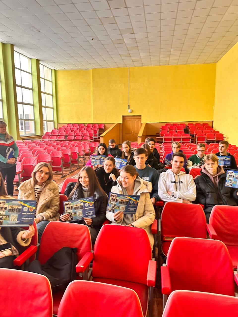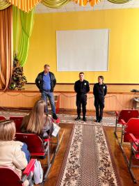 Oksana Chernenko, a lecturer of the Department of Legal Disciplines of Sumy Branch of KhNUIA, and Valerii Kudriavtsev, a leading specialist, with the participation of cadets Mykyta Dizhevskyi and Yevheniia Sereda, met with high school students of Sumy Specialized School No. 7 named after M. Savchenko as part of career guidance.