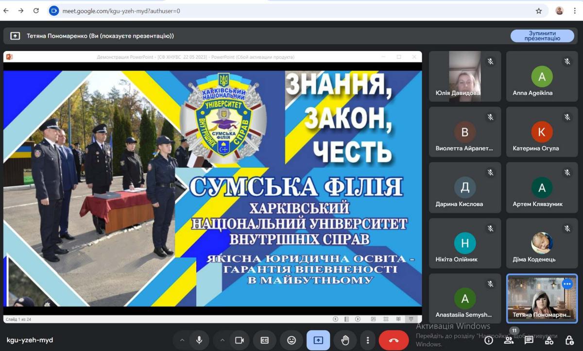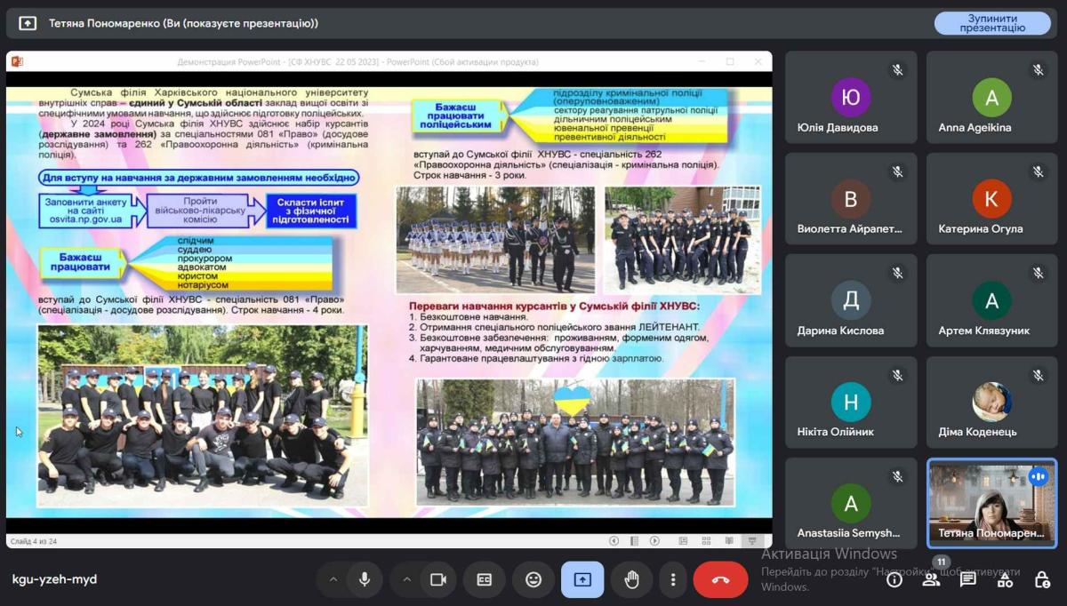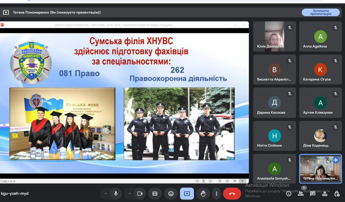 An online career guidance meeting on the topic “Professions that can be obtained by studying at Sumy branch of KhNUIA” with students of Sumy institution of general secondary education №26 was held by Associate Professor of the Department of Humanities Tetiana Ponomarenko.