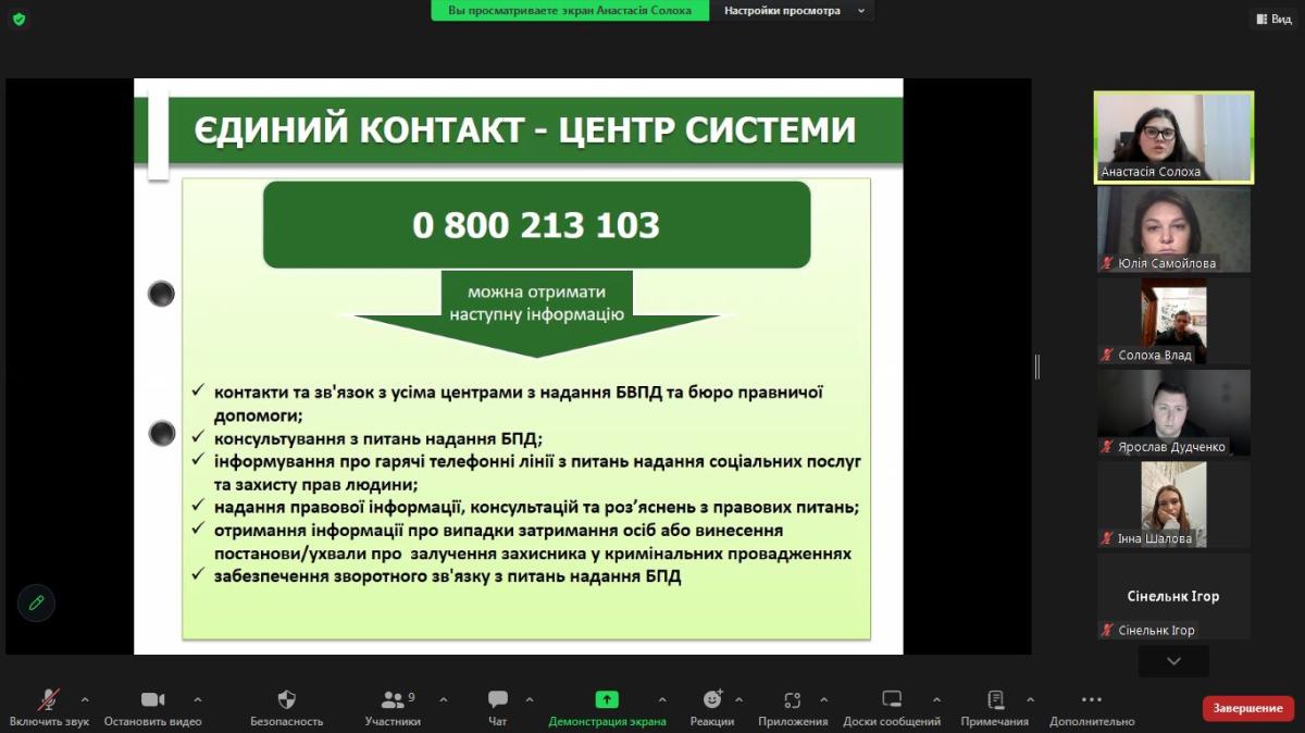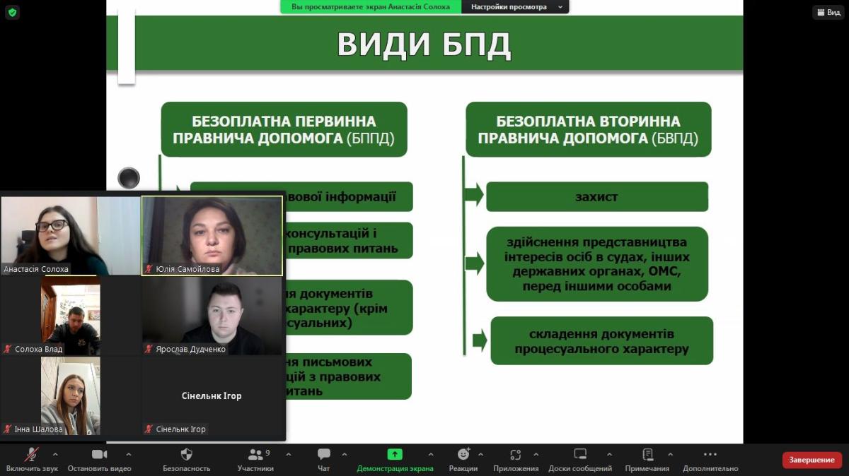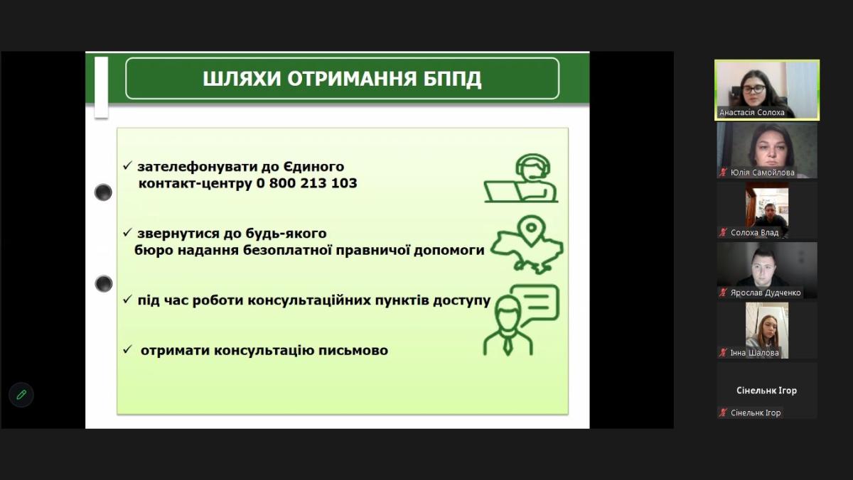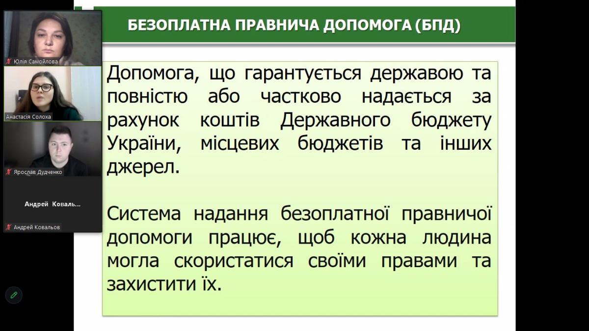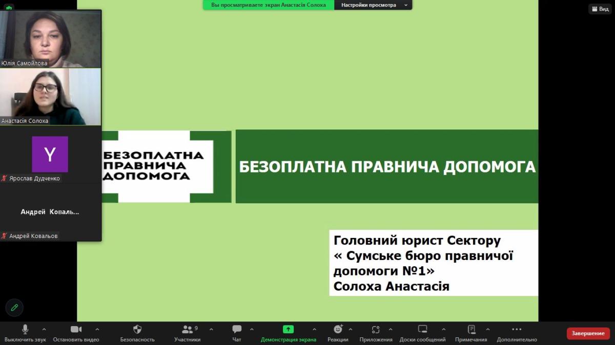 On this topic, Anastasia Solokha, chief lawyer of Sumy Legal Aid Bureau No. 1, together with Yulia Samoilova, professor of the Department of Humanities at Sumy Branch of Kharkiv National University of Internal Affairs, held a binary class for master's students in the discipline ‘Foreign Language for Professional Purposes’.