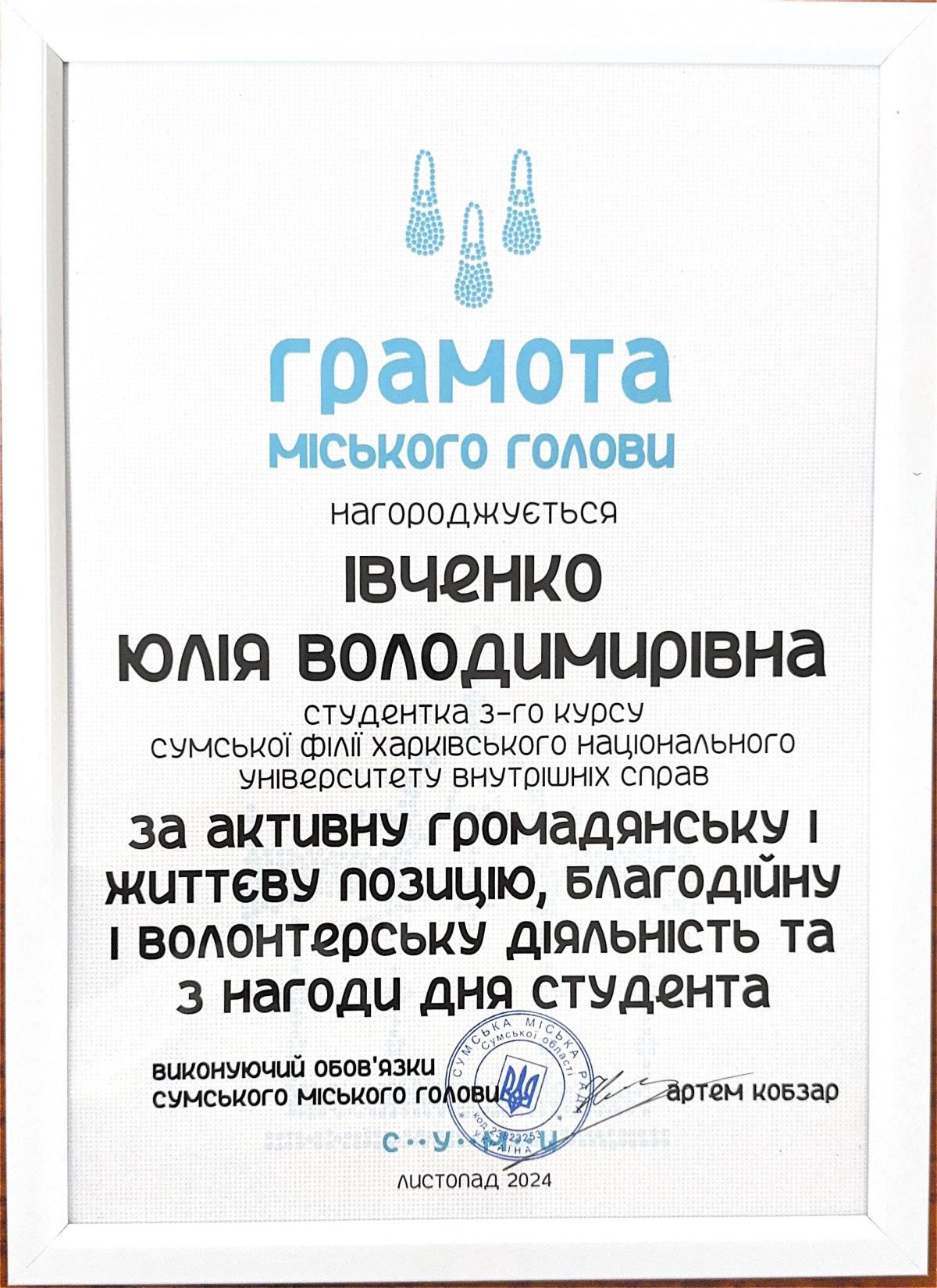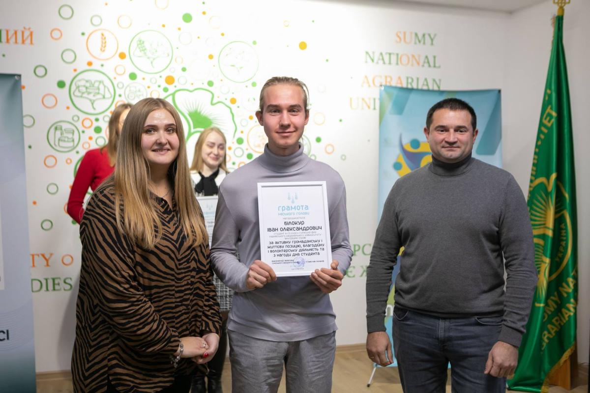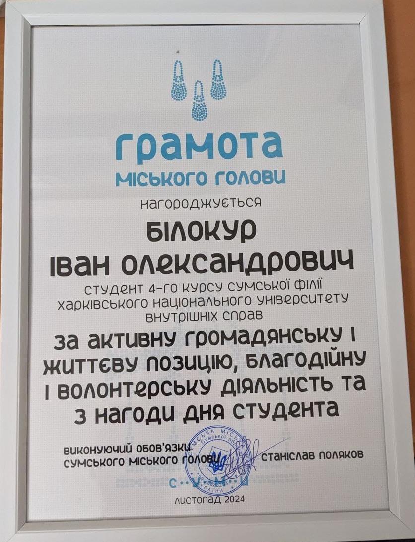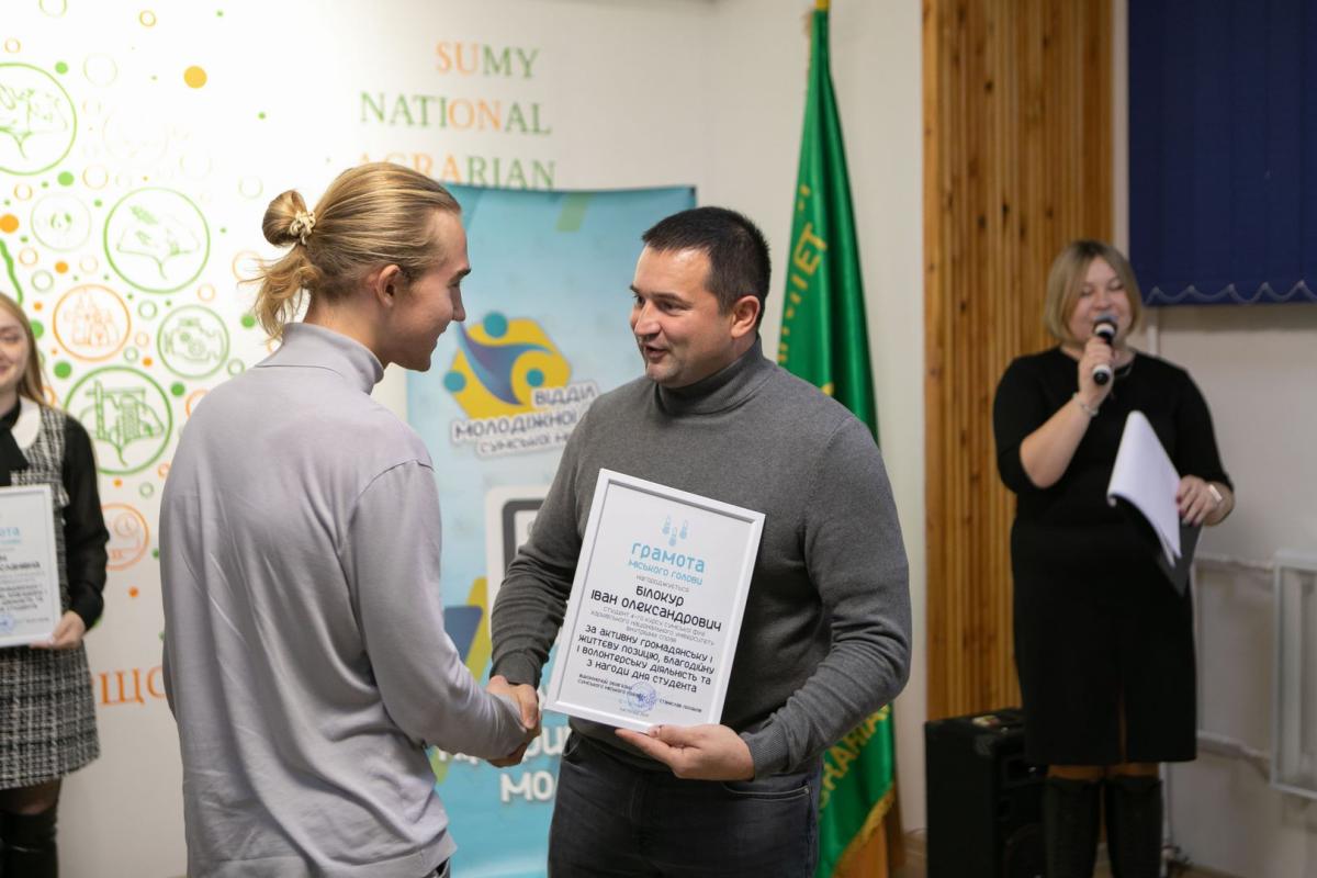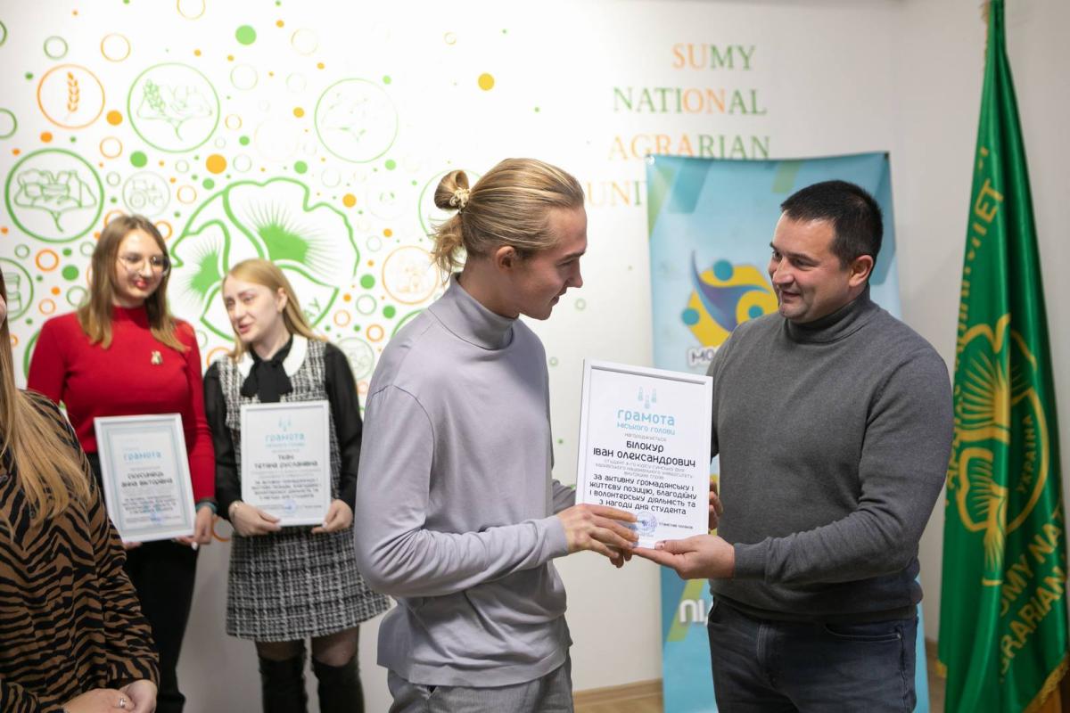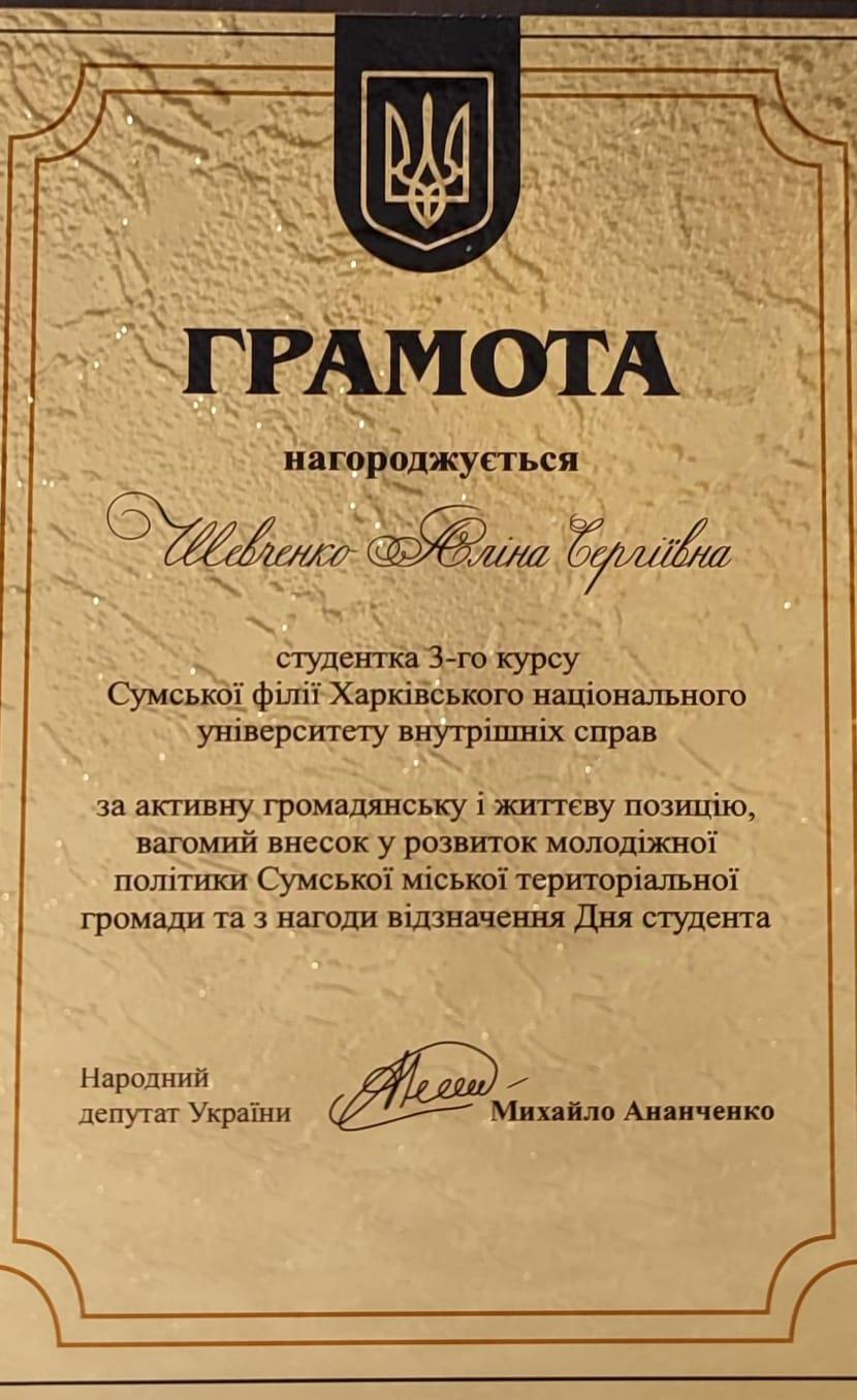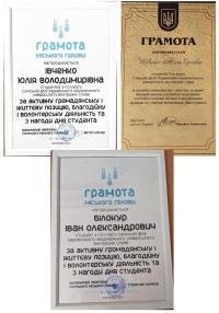 Representatives of the student and cadet self-government of Sumy branch were awarded Diplomas of the Mayor and People's Deputy of Ukraine Mykhailo Ananchenko for their active civic and life position, charitable and volunteer activities for a significant contribution to the development of youth policy of Sumy city territorial community.