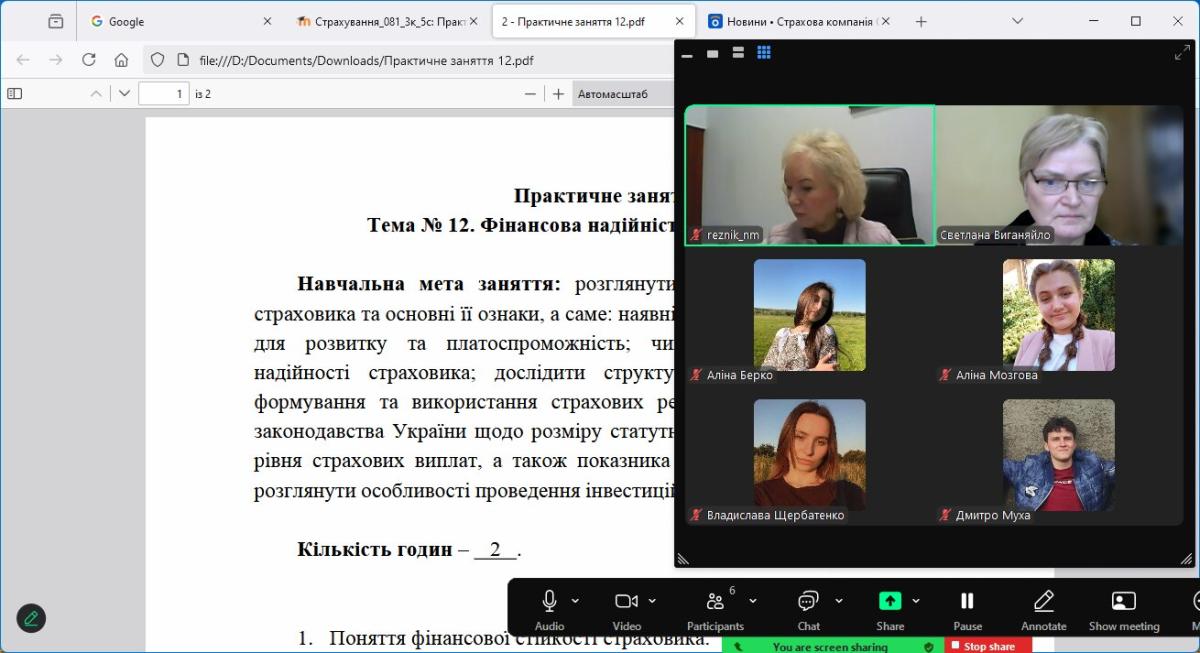 For 3rd-year students of Sumy branch of KhNUIA, studying in the specialty "Law", an online lesson was held within the framework of studying the academic discipline "Insurance" with the participation of the director of the branch of the National Joint-Stock Insurance Company (NASK) "Oranta" in Sumy, Natalia Rieznik.