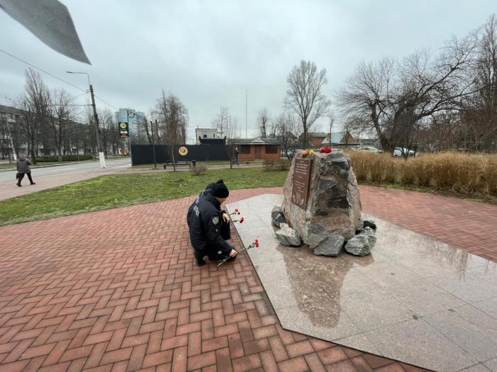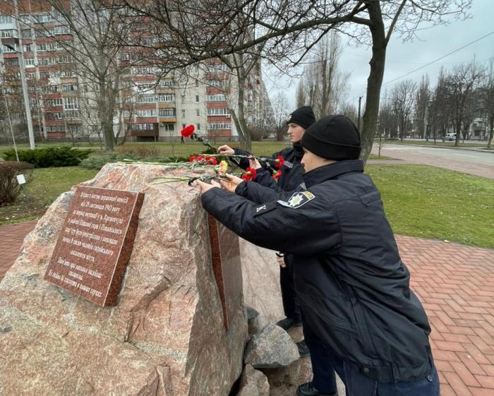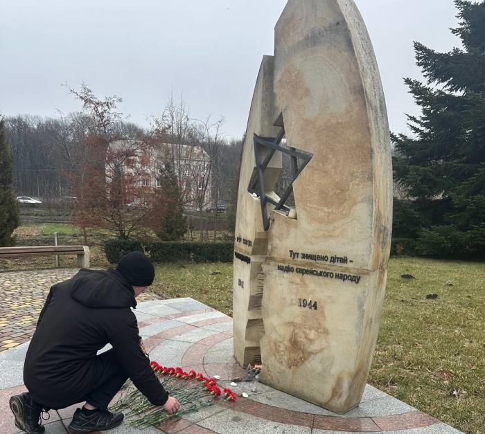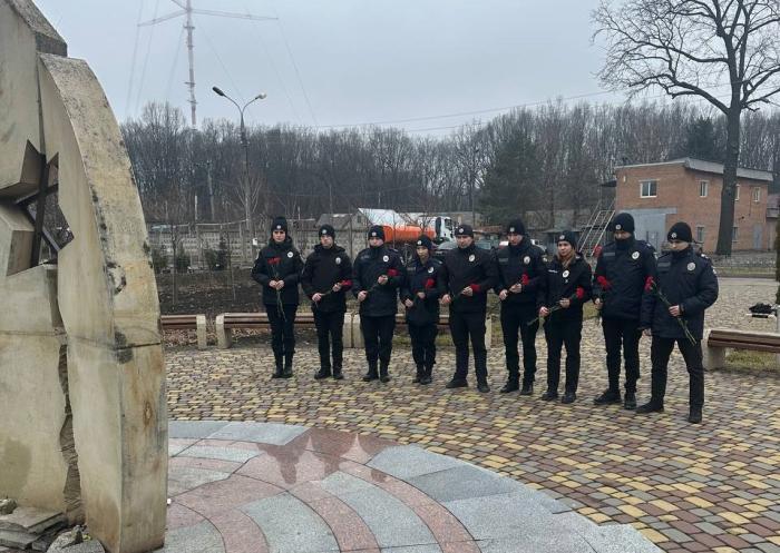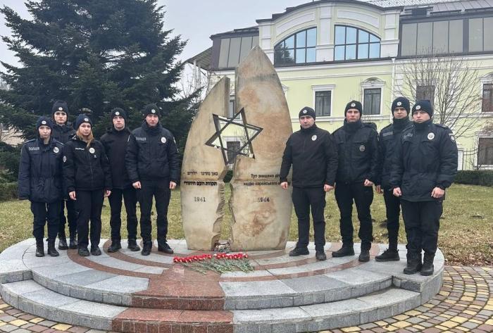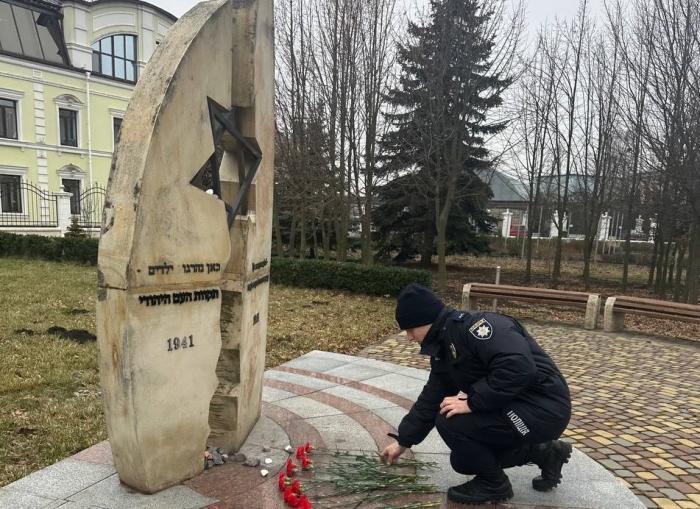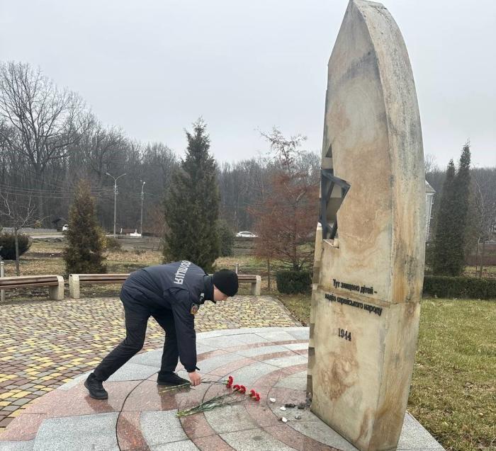 The students of Kharkiv National University of Internal Affairs put flowers at the memorial signs and observed a minute of silence to honor the memory of millions of innocent Jews and other national minorities killed during World War II.