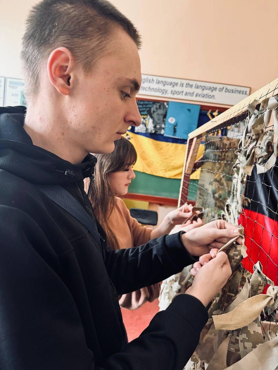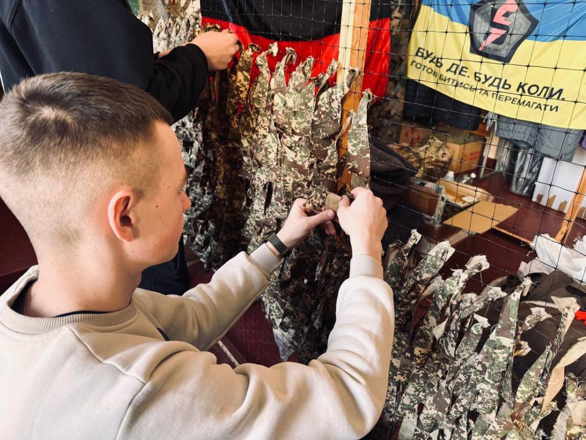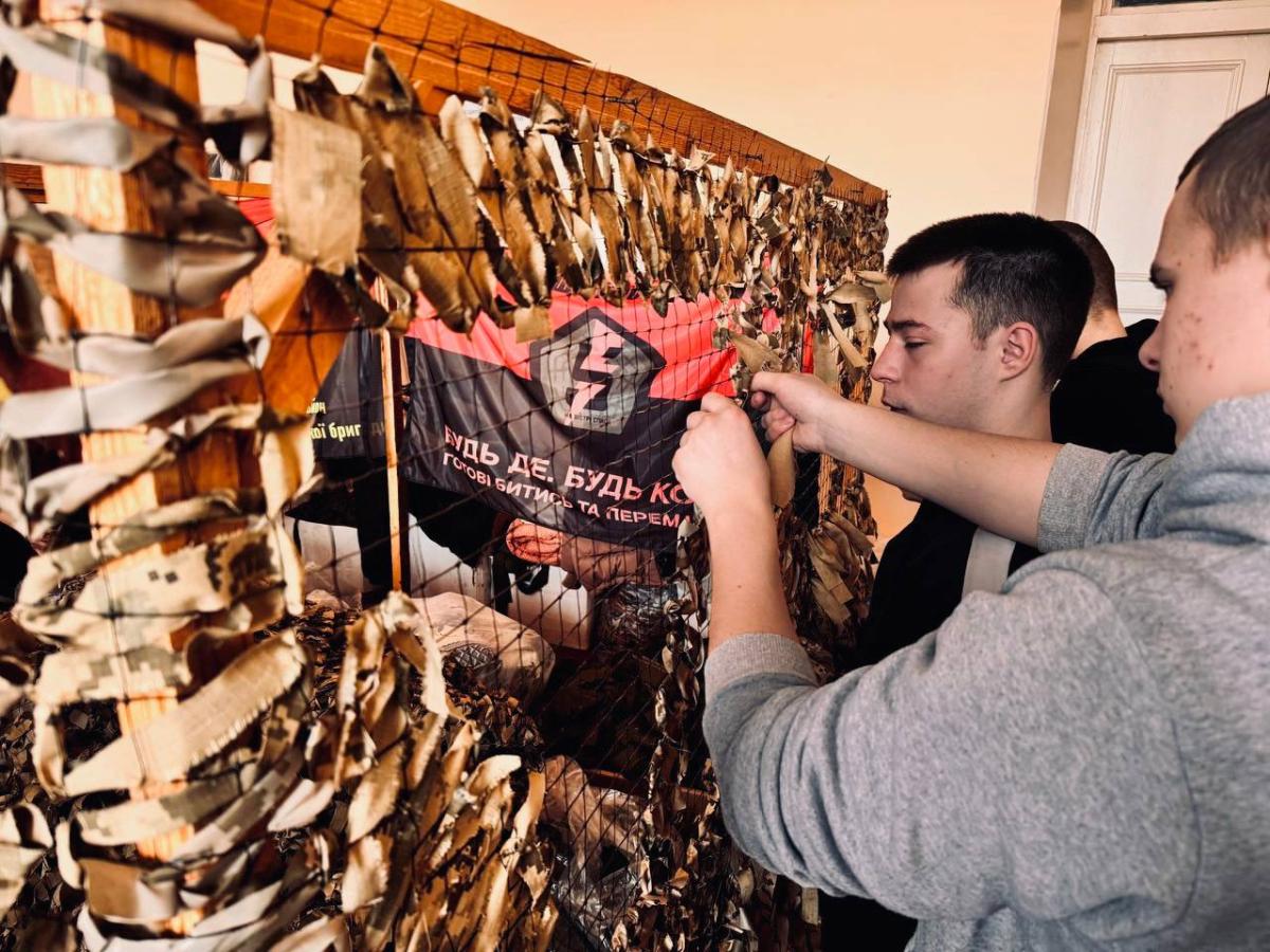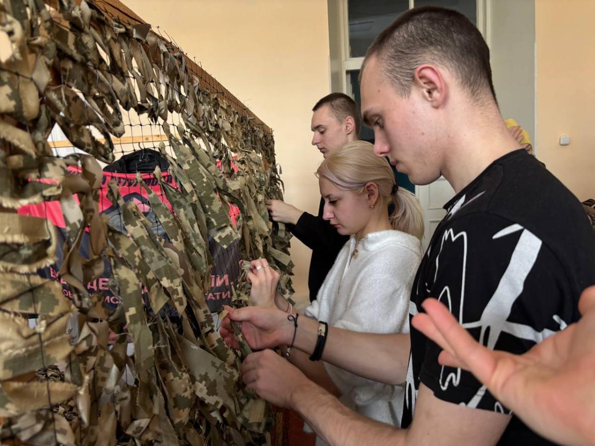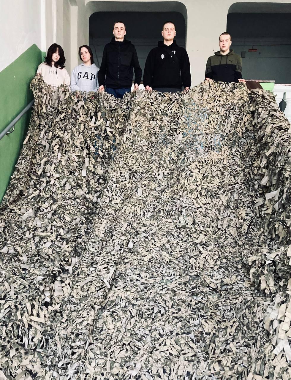 Weaving camouflage nets by students of Sumy branch of KhNUIA remains one of the extremely important initiatives. Every day, volunteers of the branch make their significant contribution to the common cause. Only in recent days, the cadets have made two camouflage nets with their own hands, which have already been transferred to the front.