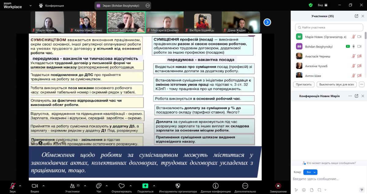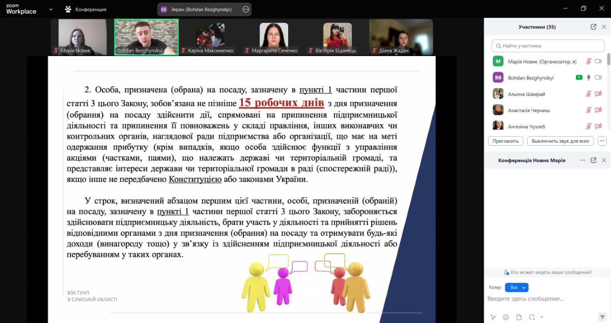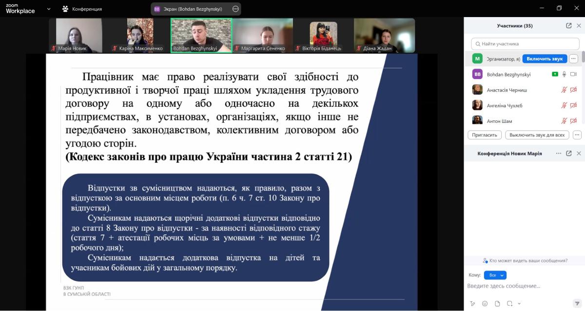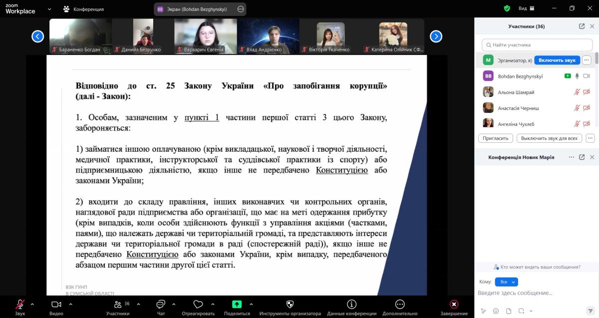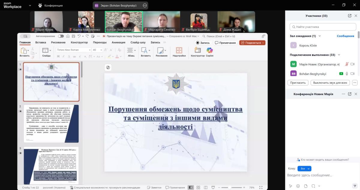 On this topic, a lesson on the academic discipline "Administrative Responsibility" was organized for 2nd-year students of specialty 081 "Law" by Maria NOVYK, a lecturer at the Department of Special Police Disciplines and Basic Military Training of Sumy Branch of KhNUIA.