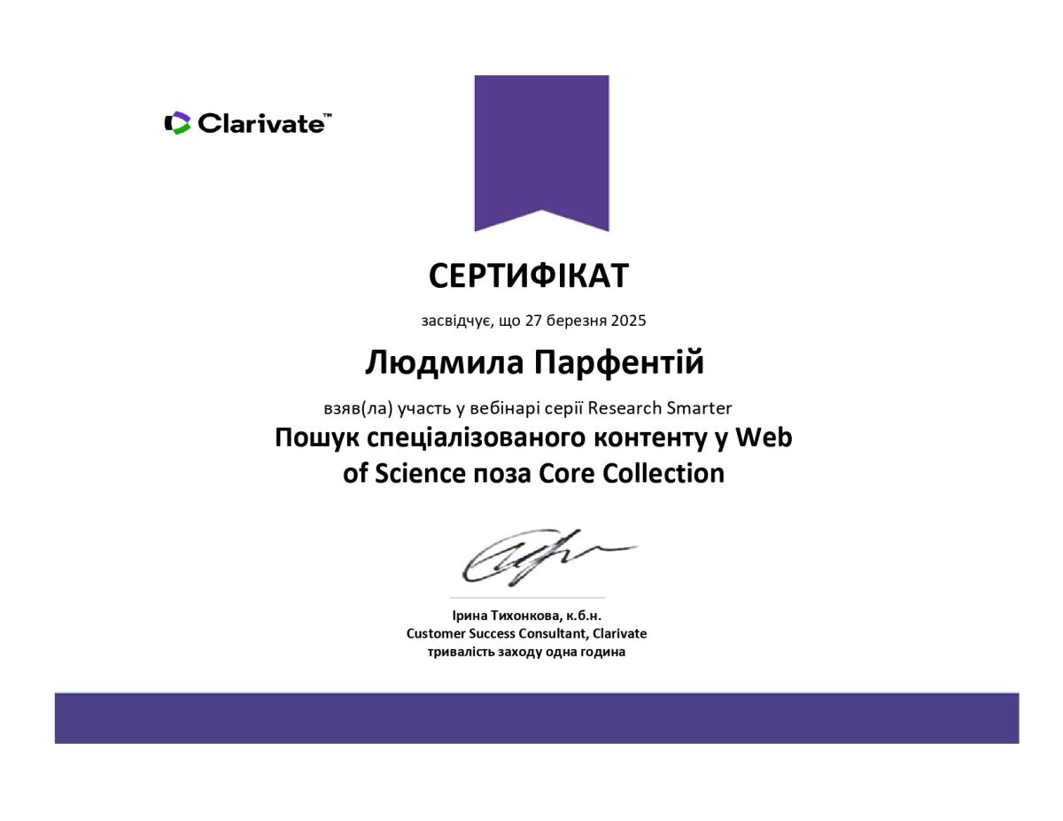 Associate Professor of the Department of Socio-Economic Disciplines of Sumy Branch of KhNUIA Liudmyla PARFENTII joined online events on the topics "Fundamentals of Scientometrics" and "Searching for Specialized Content in the Web of Science Outside the Core Collection."