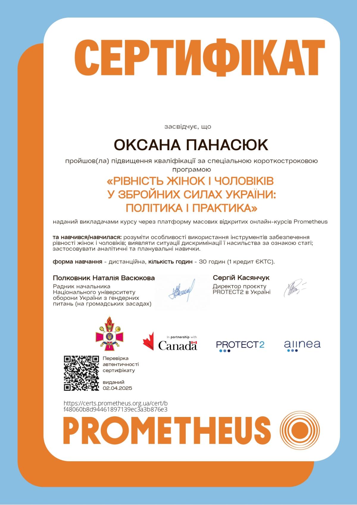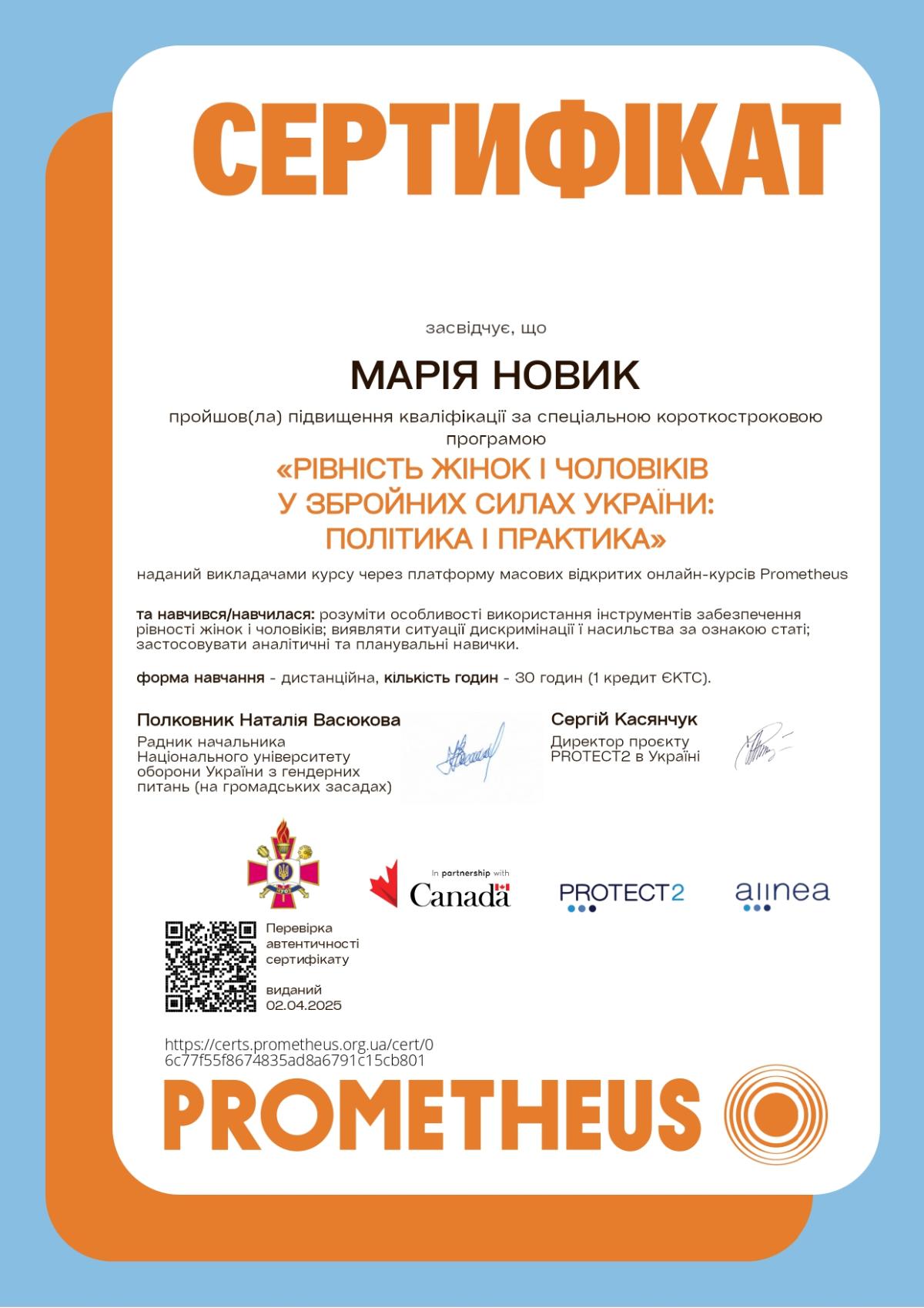 The Head of the Department of special police disciplines and basic military training of Sumy branch of KhNUIA, Oksana PANASIUK, and the lecturer of the same department, Maria NOVYK, completed online training under the special program "Equality of women and men in the Armed Forces of Ukraine: policy and practice".