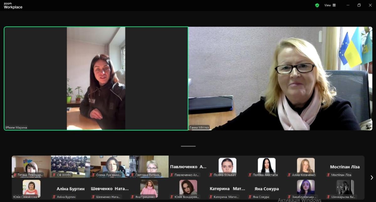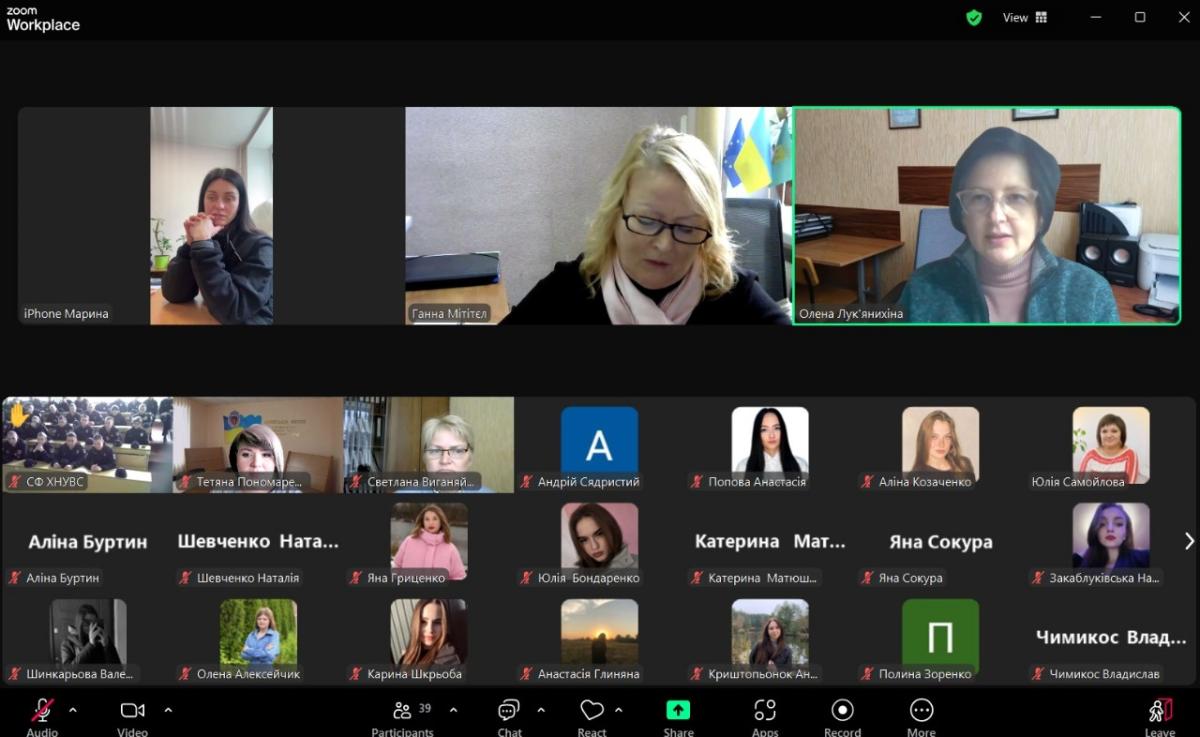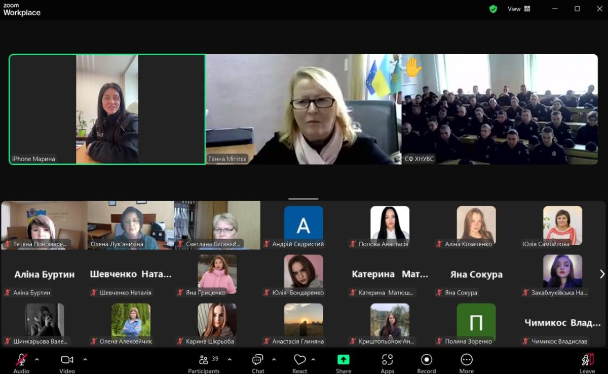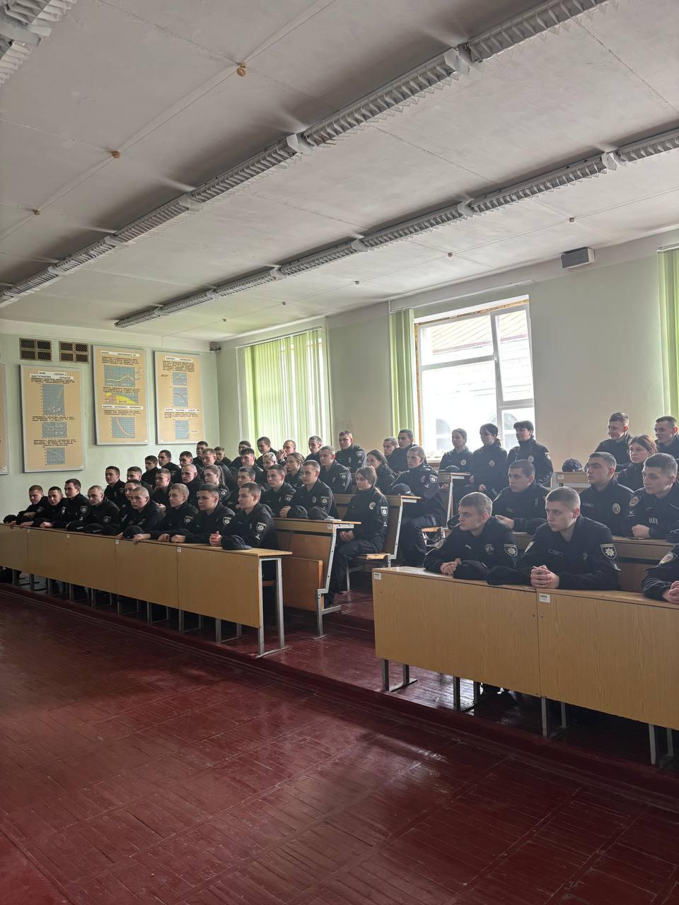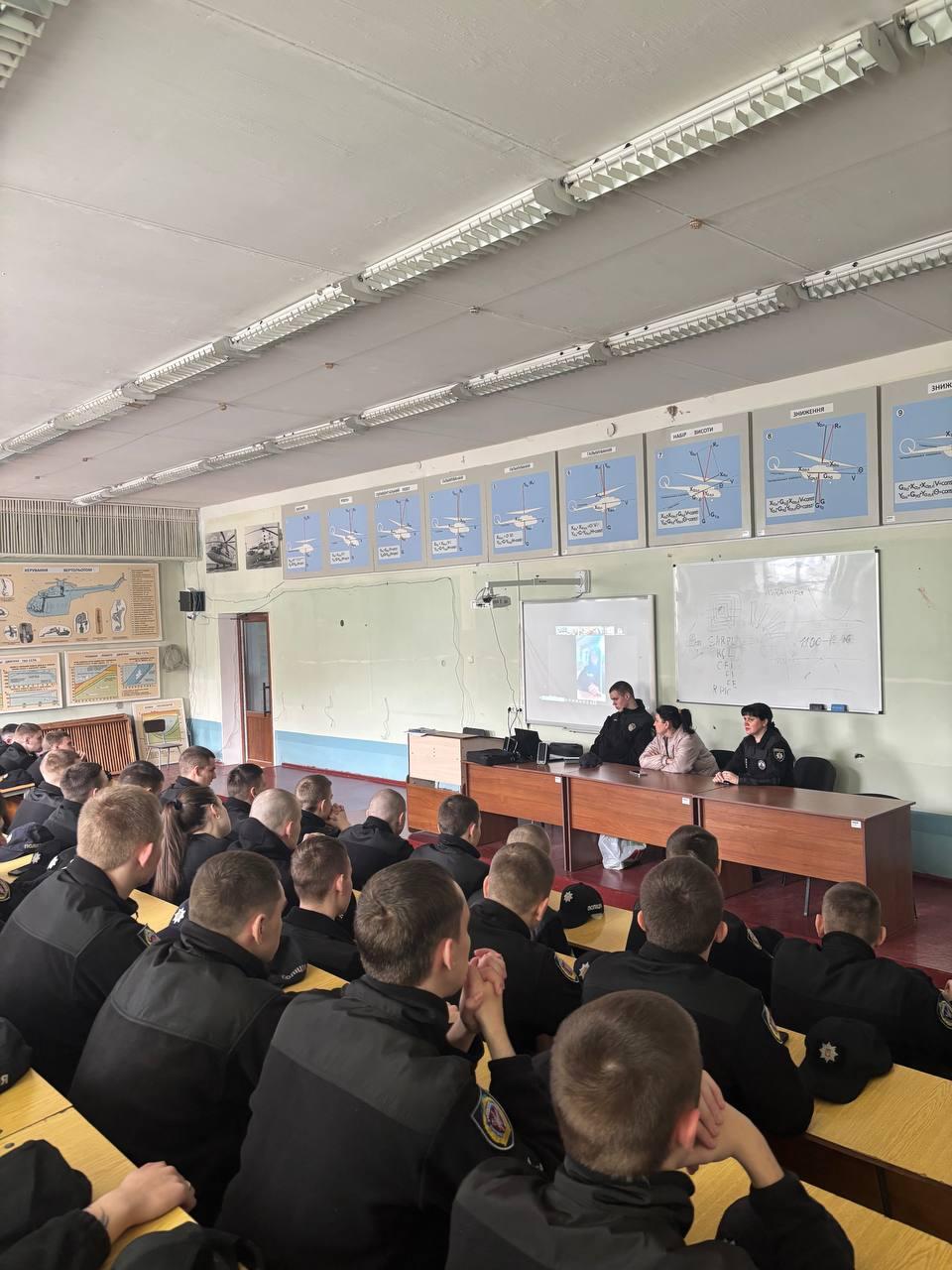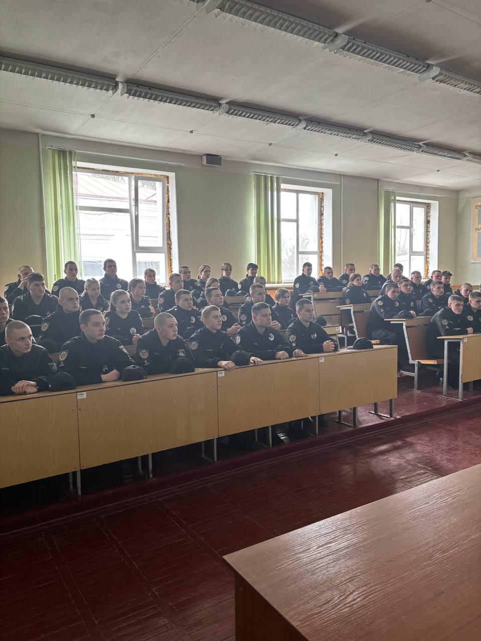 A meeting of higher education students with the inspector of the public relations sector of the Patrol Police Department in Sumy region, Maryna HORKOVSKA, took place at Sumy branch of KhNUIA. The event was also attended by the leading specialist of the educational work group, Hanna MITITIEL, Deputy Head of the course, Olena PODOINIK, and curators of the study groups.