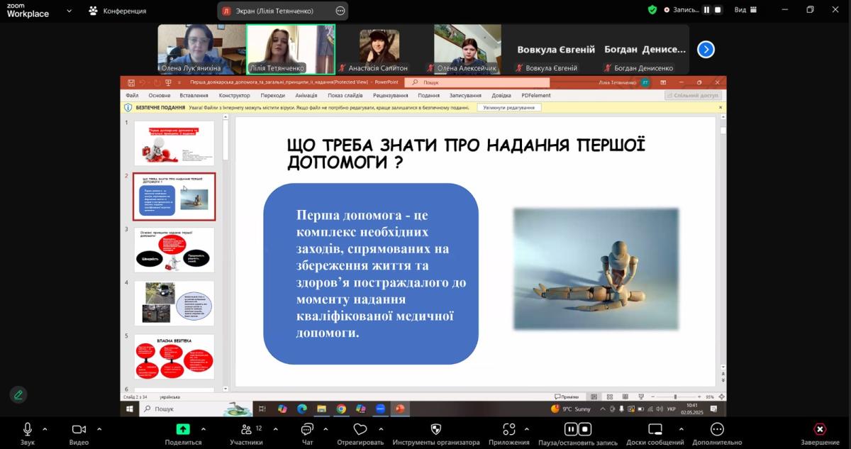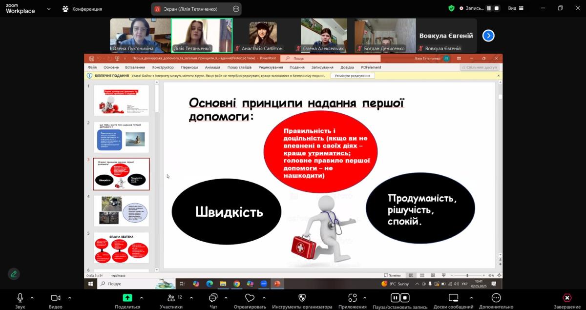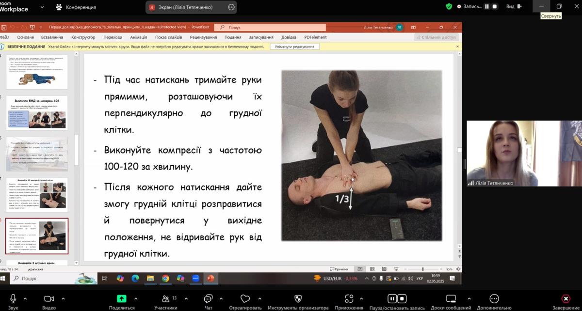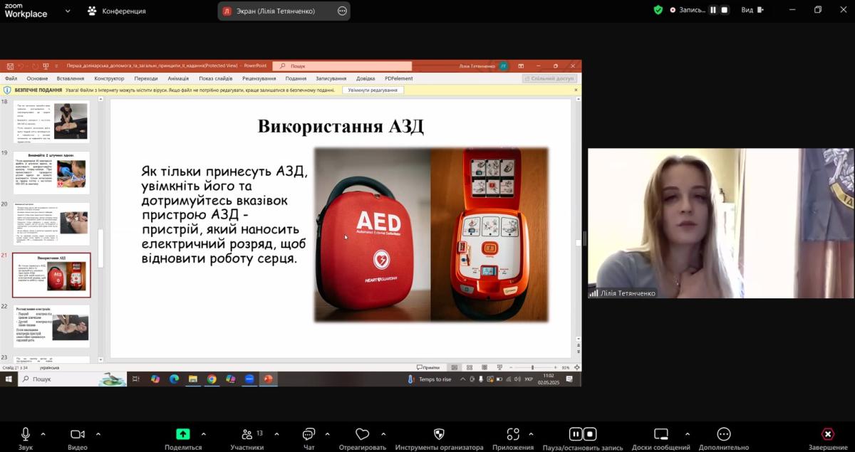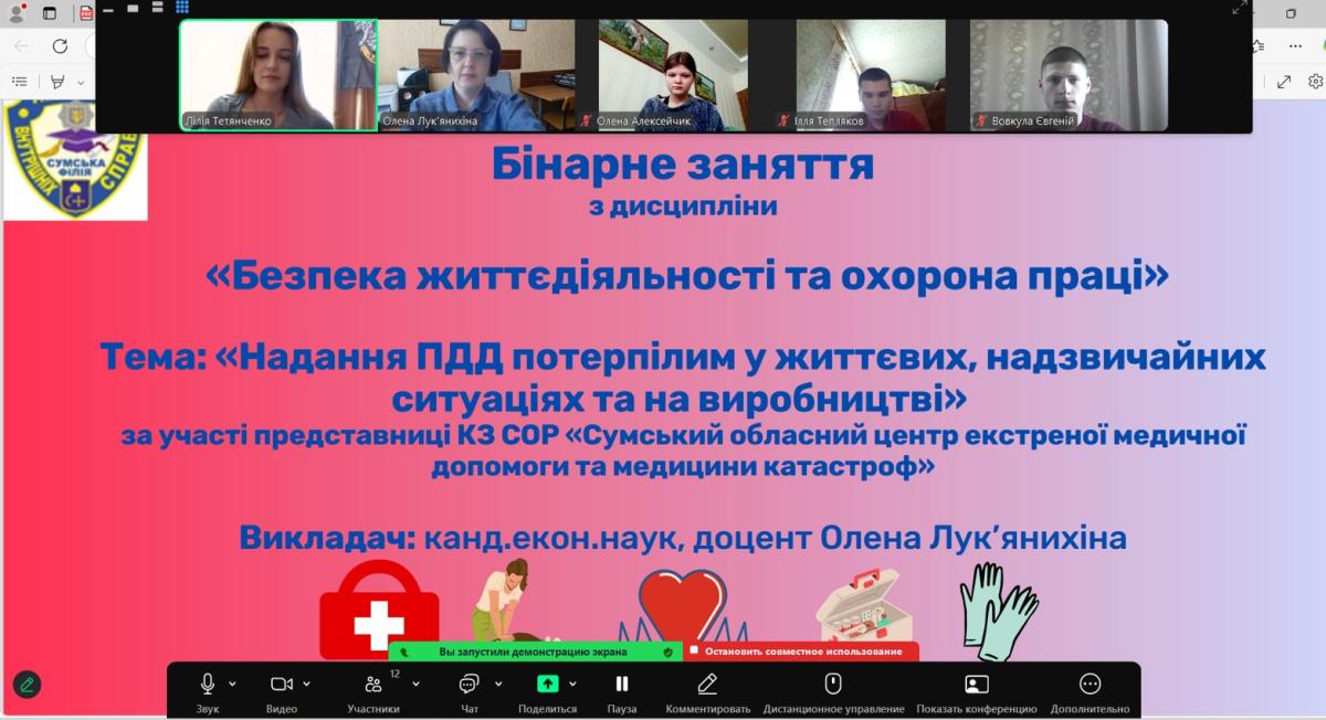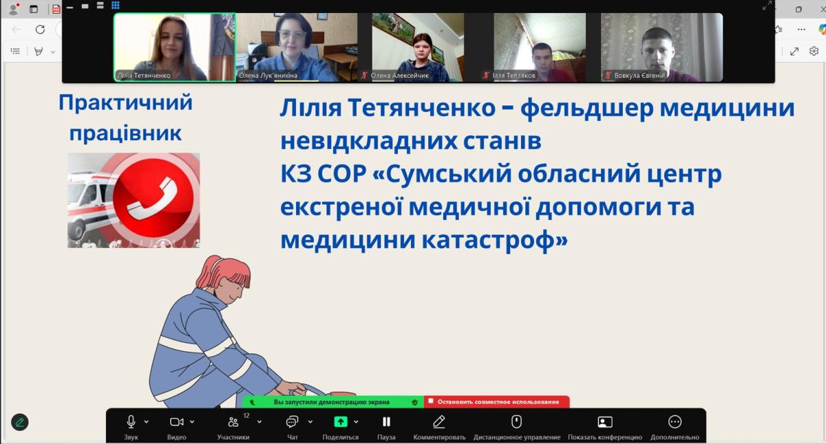 In order to ensure practice-oriented training of students studying in the specialty "Law enforcement activities", an online lesson was held with the participation of the emergency medicine paramedic of Sumy Regional Center for Emergency Medical Care and Disaster Medicine Liliia TETIANCHENKO.
