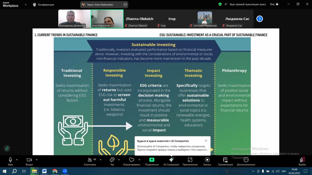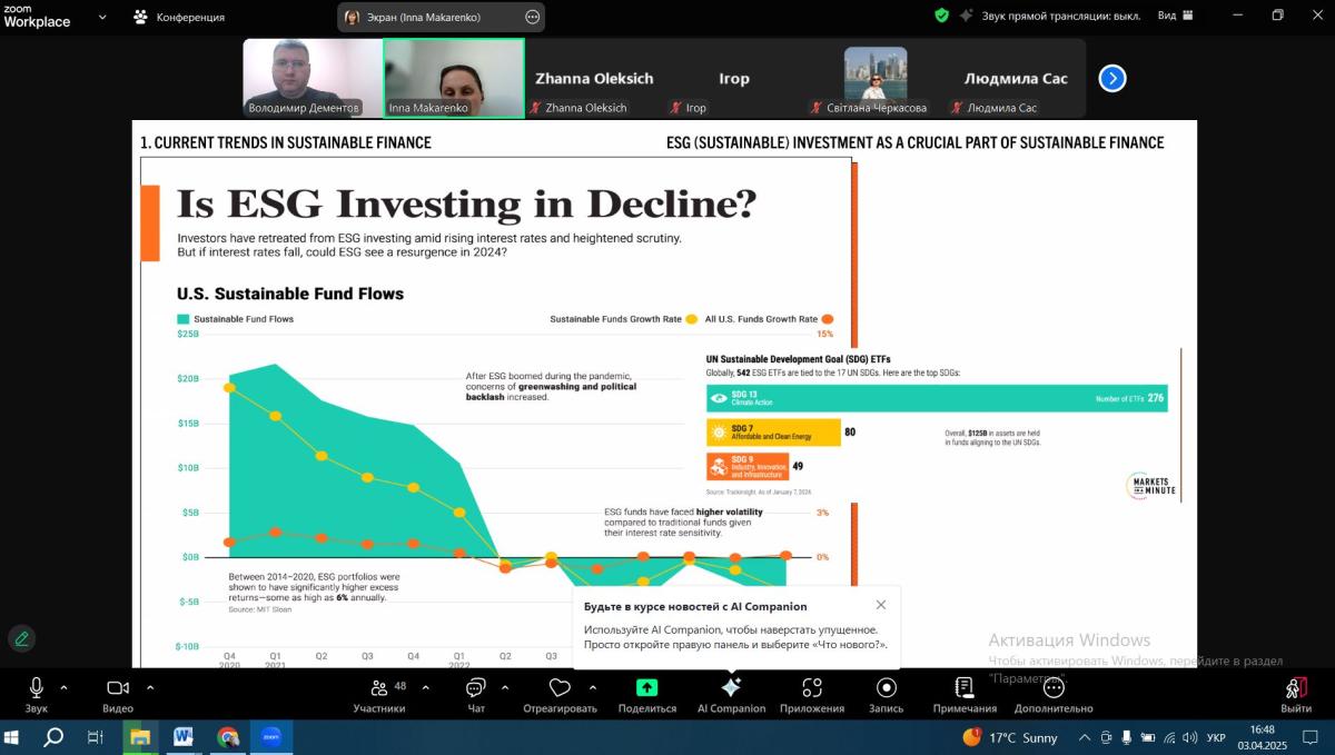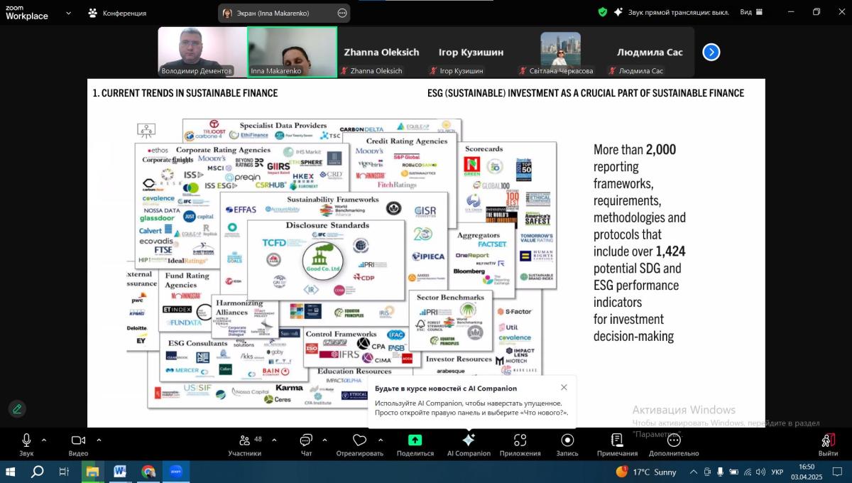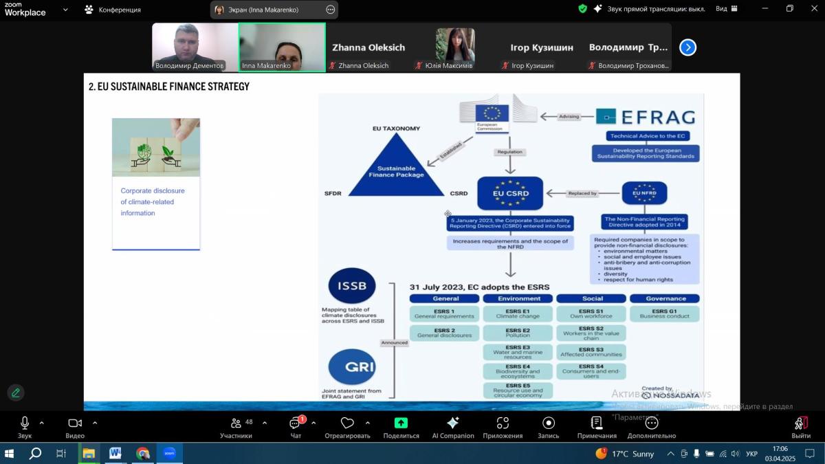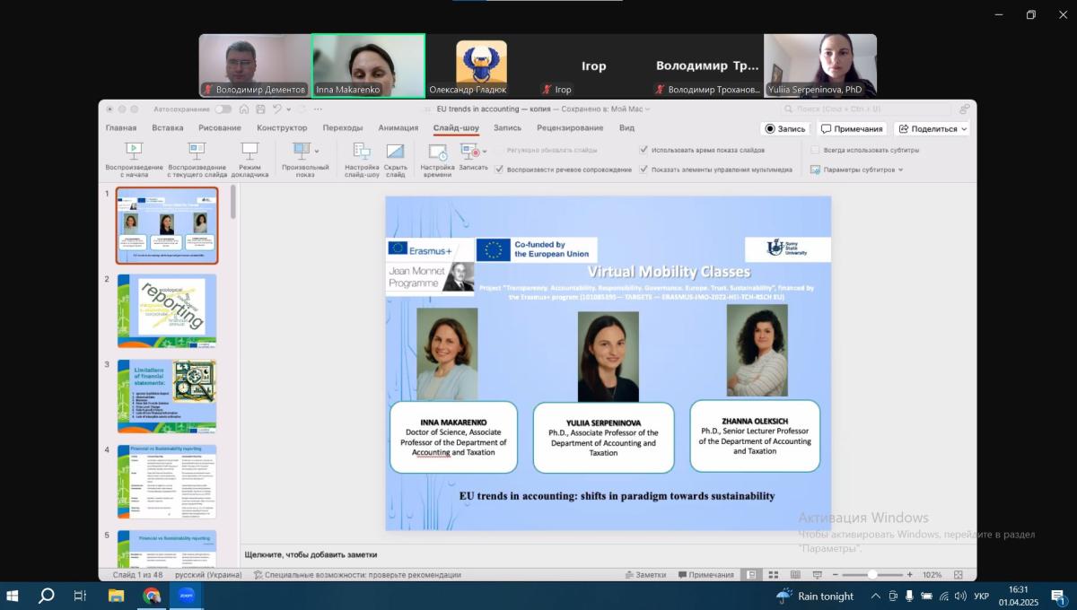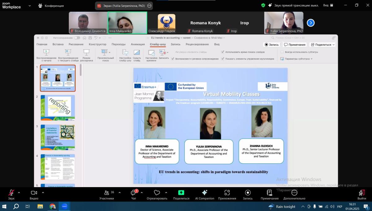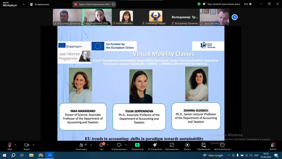 Associate Professor of the Department of Socio-Economic Disciplines of Sumy Branch of KhNUIA Volodymyr DEMENTOV took part in the virtual mobility program "EU-Ukraine Best Practices in Achieving the SDGs"-2025". The event is implemented within the framework of the Jean Monnet project "Transparency. Accountability. Responsibility. Governance. Europe. Trust. Sustainability".