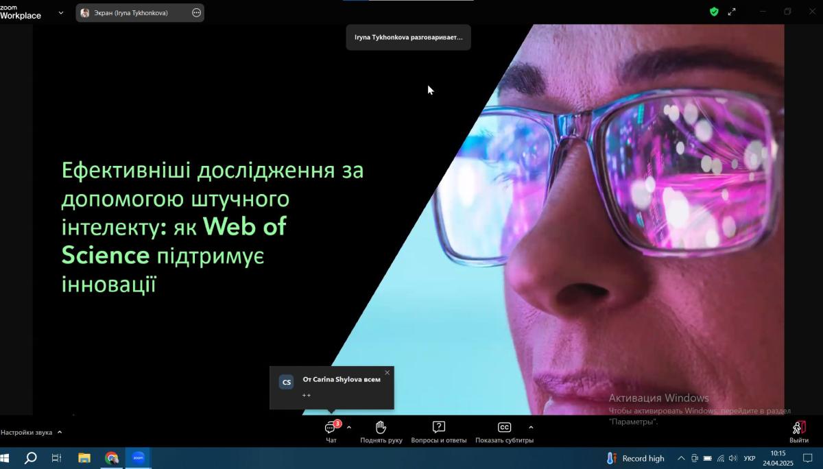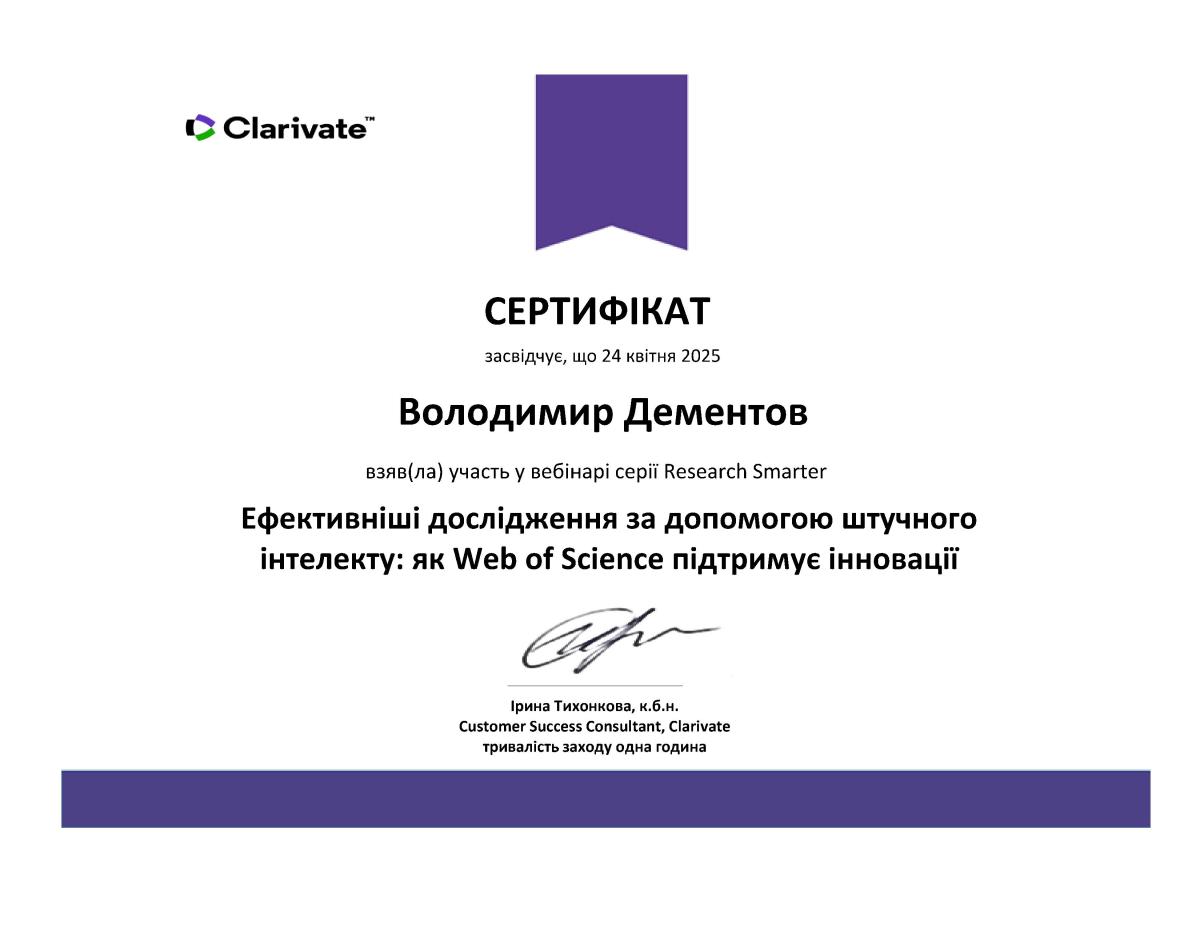 Associate Professor of the Department of Socio-Economic Disciplines of Sumy Branch of KhNUIA Volodymyr DEMENTOV joined the educational webinar on the topic "More Effective Research Using Artificial Intelligence: How the Web of Science Supports Innovation."