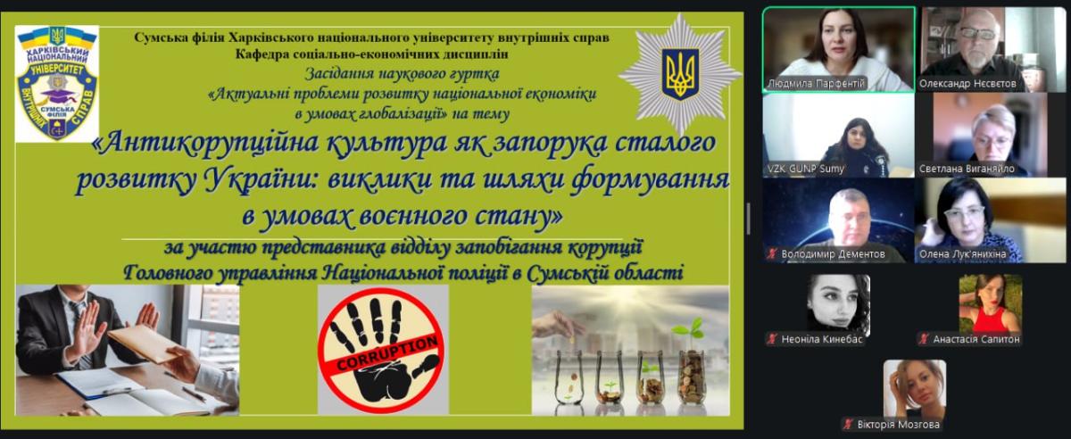 У межах Тижня доброчесності, приуроченого до Міжнародного дня боротьби з корупцією, доцент кафедри гуманітарних дисциплін Сумської філії ХНУВС Тетяна Пономаренко взяла участь у вебінарі «Корупція: повідомляй правильно. Гід для викривачів та заявників» від Національного агентства з питань запобігання корупції.