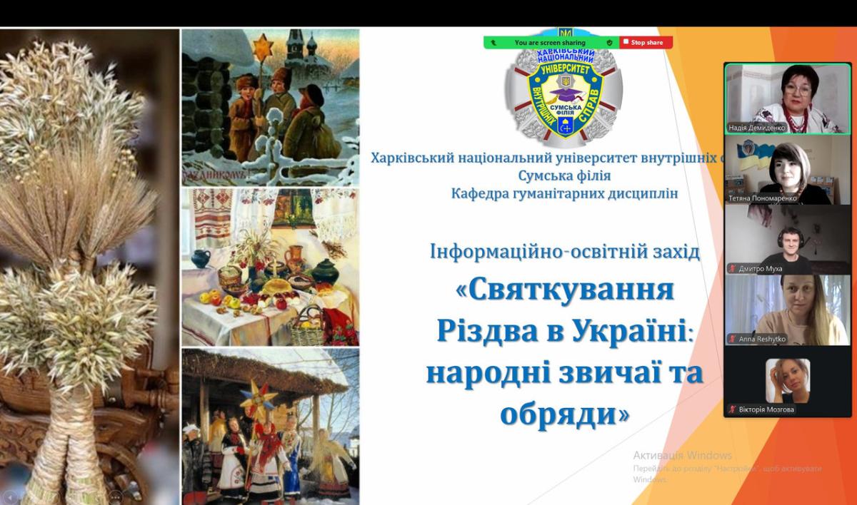 Для здобувачів вищої освіти 2 курсу спеціальностей Право та Правоохоронна діяльність, 4 курсу спеціальності Право Сумської філії ХНУВС (куратори – викладачі кафедри гуманітарних дисциплін Надія Демиденко, Тетяна Пономаренко, Анна Решитько) був проведений просвітницький захід, присвячений святкуванню Різдва, яке відзначається найбільшою кількістю народних обрядів, звичаїв та традицій.