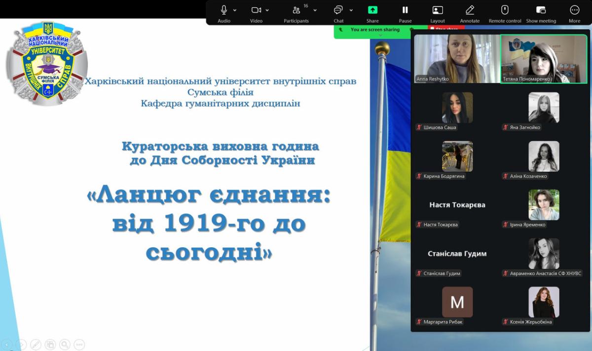 З нагоди відзначення Дня Соборності України для здобувачів вищої освіти 2 курсу спеціальностей Право та Правоохоронна діяльність груп СФдср-24-1Пр і СФдср-24-2Пд доцентом кафедри гуманітарних дисциплін Сумської філії ХНУВС Тетяною Пономаренко та старшим викладачем Анною Решитько організовано і проведено кураторську годину на тему «Ланцюг єднання: від 1919-го до сьогодні».