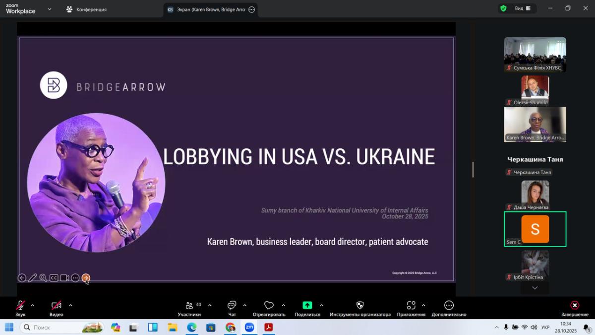 На базі Сумської філії ХНУВС відбулася онлайн-зустріч студентів та курсантів із міжнародною експерткою у сфері лобізму — Карен Браун (м. Чикаго, США), бізнес-лідеркою, членкинею ради директорів та адвокаткою з питань захисту прав пацієнтів. Захід було проведено з використанням платформи Zoom, що забезпечило широке охоплення аудиторії та ефективну комунікацію між учасниками.