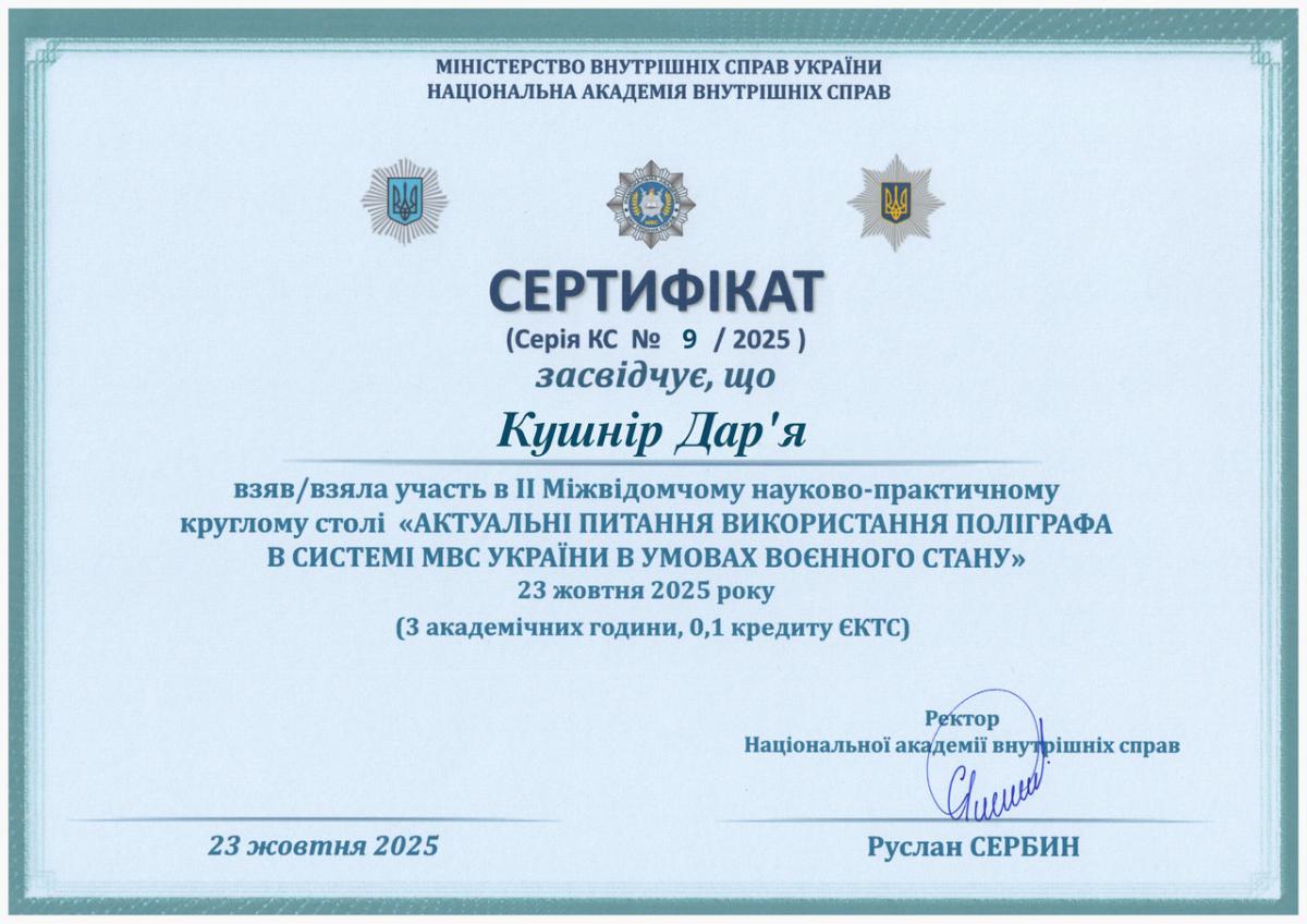 Старший викладач кафедри юридичних дисциплін Сумської філії Харківського національного університету внутрішніх справ Дар’я Кушнір взяла участь у Міжнародному науково-практичному форумі «Актуальні питання використання поліграфа в діяльності органів сектору безпеки і оборони України в умовах воєнного стану та повоєнної відбудови країни».