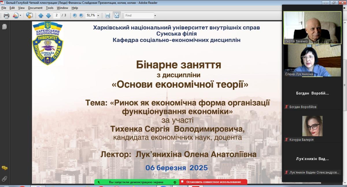 Начальник управління муніципальної безпеки Сумської міської ради, депутат Сумської районної ради Віталій ДЕЙНИЧЕНКО разом зі старшим викладачем кафедри юридичних дисциплін Сумської філії ХНУВС Андрієм СЯДРИСТИМ провели бінарне заняття для курсантів 2 курсу в рамках вивчення дисципліни "Адміністративне право» на тему: «Органи виконавчої влади та місцевого самоврядування як суб’єкти адміністративного права».