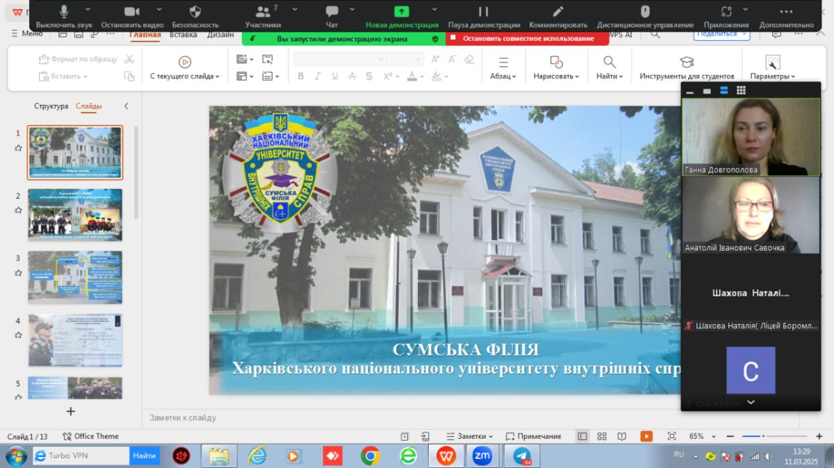 На базі Сумської філії ХНУВС відбулася онлайн-зустріч студентів та курсантів із міжнародною експерткою у сфері лобізму — Карен Браун (м. Чикаго, США), бізнес-лідеркою, членкинею ради директорів та адвокаткою з питань захисту прав пацієнтів. Захід було проведено з використанням платформи Zoom, що забезпечило широке охоплення аудиторії та ефективну комунікацію між учасниками.