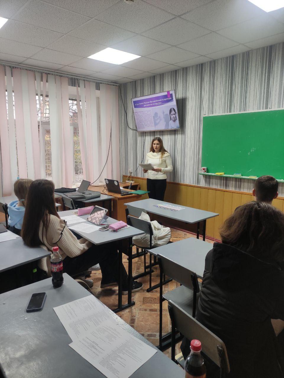 У межах Всеукраїнської кампанії «16 днів проти насильства» завідувач кафедри соціально-економічних дисциплін Олена Лук’янихіна провела тематичне заняття для студентів першого курсу спеціальності Право на тему: «Домашнє насильство – характеристика, види, негативний вплив на соціум, приклади по Україні, методи та механізми запобігання».
