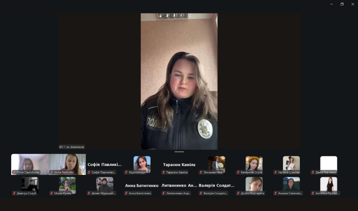 Зі здобувачами вищої освіти 1 курсу спеціальності К9 Правоохоронна діяльність організоване і проведене бінарне заняття з навчальної дисципліни «Філософія» на тему «Проблема людини у філософії. Свобода вибору, колабораціонізм та диверсійна діяльність» доцентом кафедри гуманітарних дисциплін Сумської філії ХНУВС Тетяною Пономаренко за участі старшого інспектора сектору зв’язків з громадськістю управління патрульної поліції в Сумській області, старшого лейтенанта поліції Людмили Олійник.