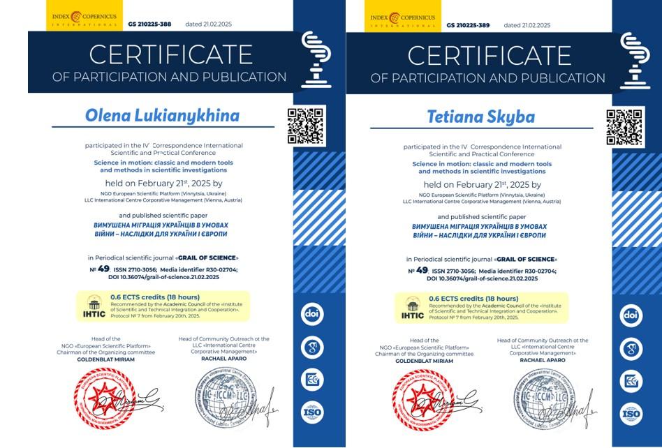 21 лютого 2025 року професор кафедри соціально-економічних дисциплін кандидат економічних наук, доцент Лук’янихіна Олена Анатоліївна разом із студенткою 2 курсу гр Сф дср23-1Пр Скибою Тетяною Геннадіївною взяли участь у IV Міжнародній науково-практичній конференції «SCIENCE IN MOTION: CLASSIC AND MODERN TOOLS AND METHODS IN SCIENTIFIC INVESTIGATIONS» (Vinnytsia, UKR - Vienna, AUT (Online).