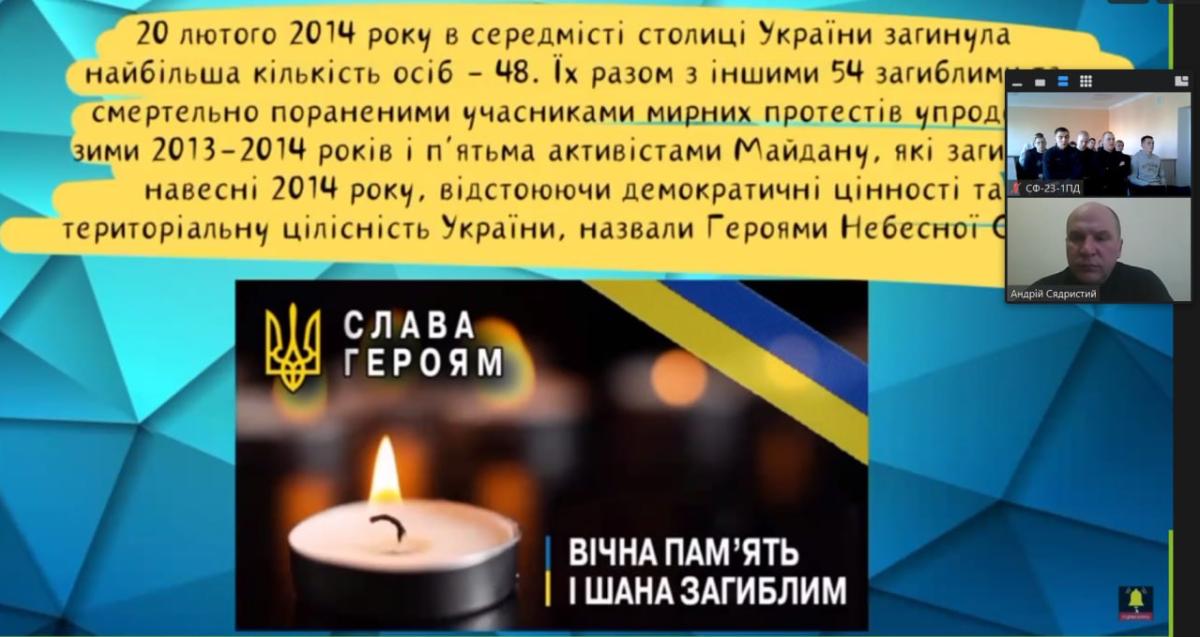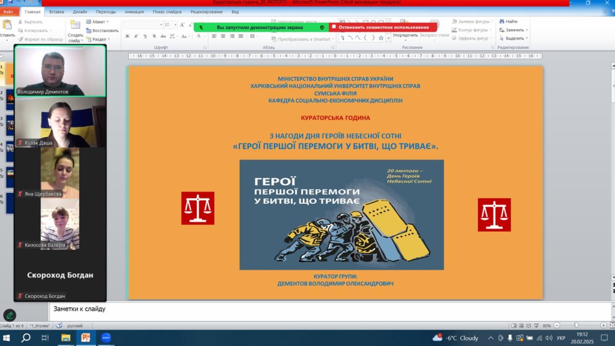 20 лютого 2025 року, в рамках виконання Плану заходів Харківського національного університету внутрішніх справ до Дня Героїв Небесної Сотні та згідно з затвердженим планом роботи куратора, доцент кафедри соціально-економічних дисциплін Володимир Дементов провів зі студентами групи СФ-дср-23-2Пд кураторську годину з нагоди Дня Героїв небесної Сотні – пам'ятного дня, який встановлений указом Президента України від 11 лютого 2015 року, з метою увічнення великої людської, громадянської і національної відваги та самовідданості, сили духу й стійкості громадян, завдяки яким змінено хід історії нашої держави, гідного вшанування подвигу Героїв Небесної Сотні.