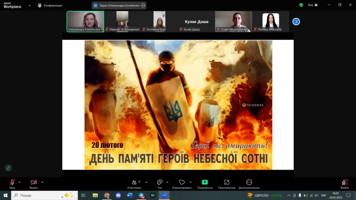 20 лютого 2025 року на засіданні наукового гуртка кафедри юридичних дисциплін «Bona fides» Сумської філії ХНУВС вшановано пам’ять Героїв Небесної Сотні та обговорено події Революції Гідності.