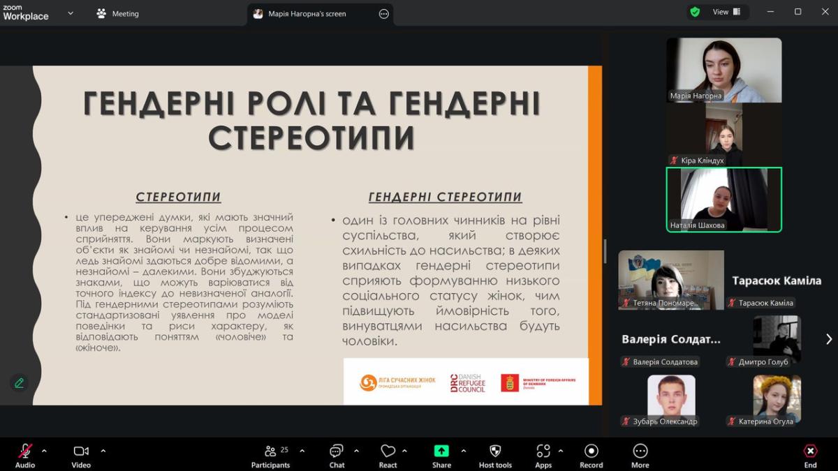 Зі здобувачами вищої освіти 1 курсу спеціальності К9 Правоохоронна діяльність доцентом кафедри гуманітарних дисциплін Сумської філії ХНУВС Тетяною Пономаренко організоване і проведене бінарне заняття з навчальної дисципліни «Філософія» на тему «Суспільство як об’єкт філософського аналізу. Гендерні ролі і стереотипи» за участі Марії Нагорної, мобілізаторки громади ГО «Ліга сучасних жінок».