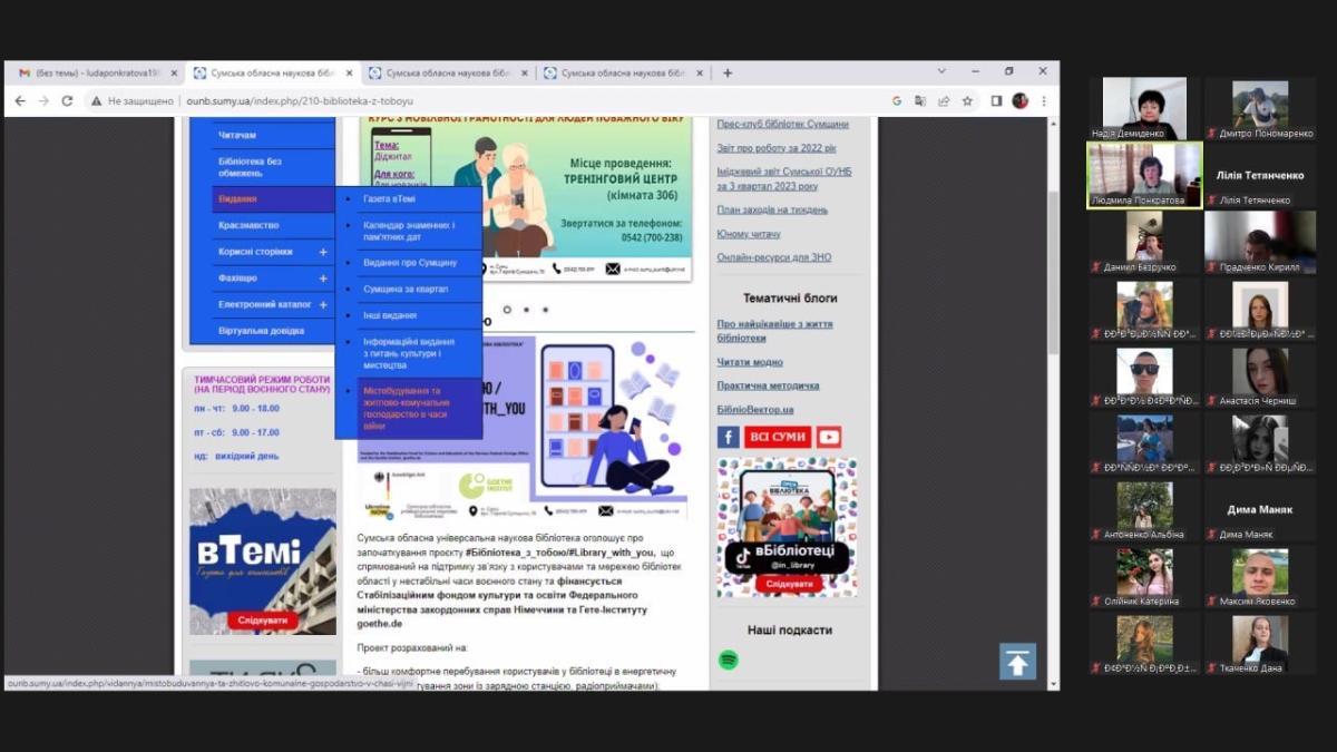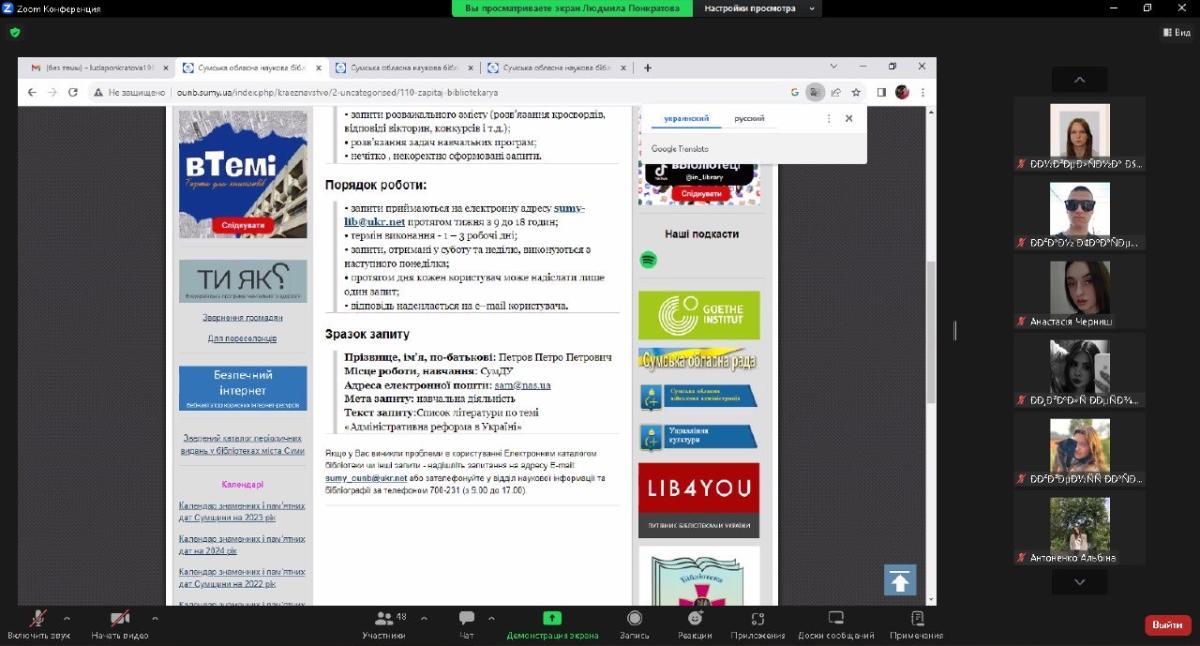 • ознайомлення з діяльністю «віртуальної довідкової служби» наукових бібліотек для замовлення списків літератури в режимі онлайн, дистанційному замовленні оцифрованих документів (книг, статей тощо);