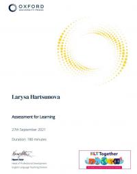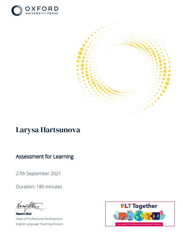 Старший викладач кафедри гуманітарних дисциплін Лариса Гарцунова взяла участь у двотижневому циклі вебінарів «ELT Together 2021», організованих Oxford University Press https://elt.oup.com/events/global/elt-together-2021?cc=ua&selLanguage=uk&mode=hub для викладачів англійської мови як іноземної.