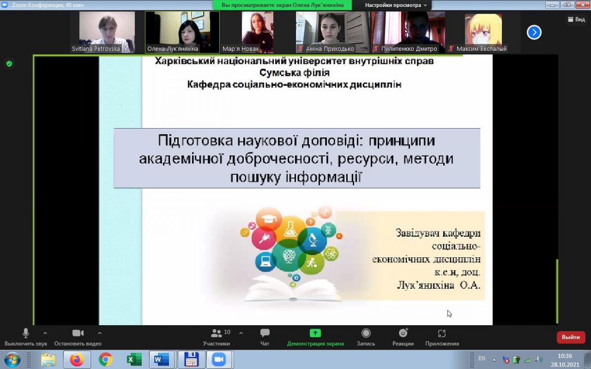 Завідувач кафедри, кандидат економічних наук, доцент Олена ЛУК’ЯНИХІНА провела бесіду на тему «Підготовка наукової доповіді: принципи академічної доброчесності, ресурси, методи пошуку інформації».