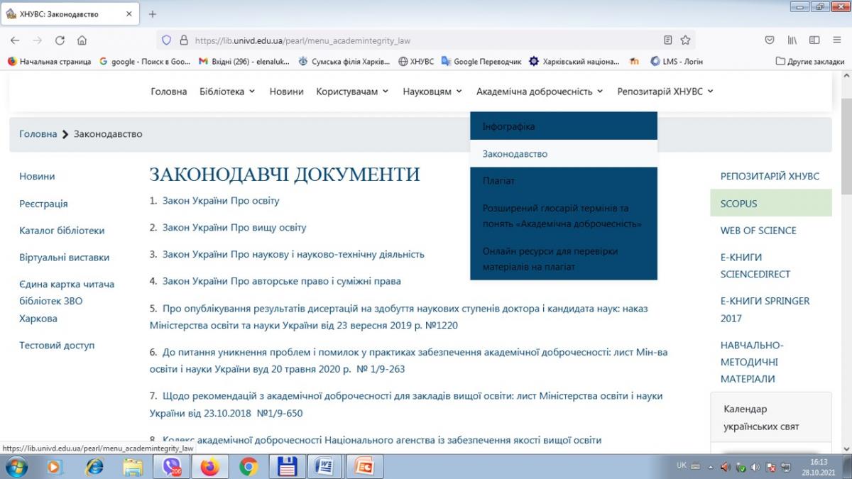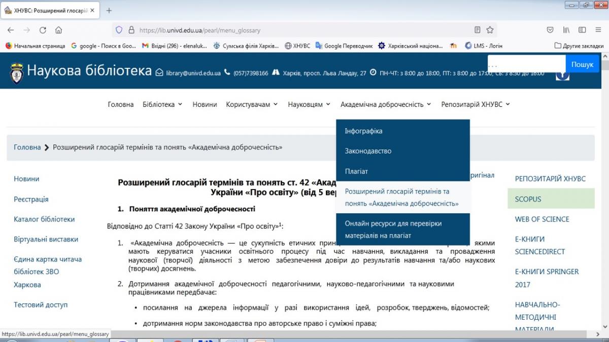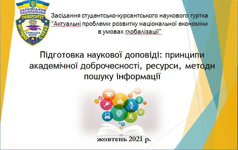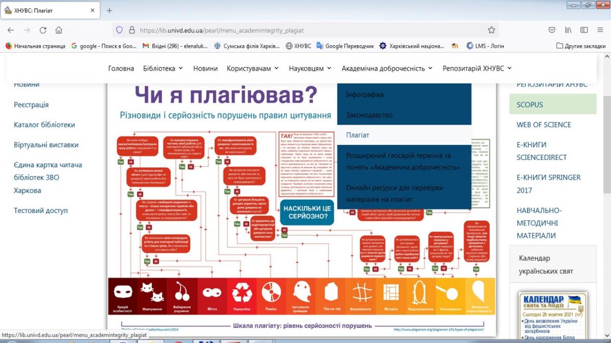 Доповідач продемонструвала, де на сайтах Харківського національного університету внутрішніх справ та Сумської філії розміщені нормативні документи, що регламентують питання академічної доброчесності, а також інша корисна інформація з цього напрямку (слайди, інфографіка, безкоштовні ресурси для перевірки на плагіат).