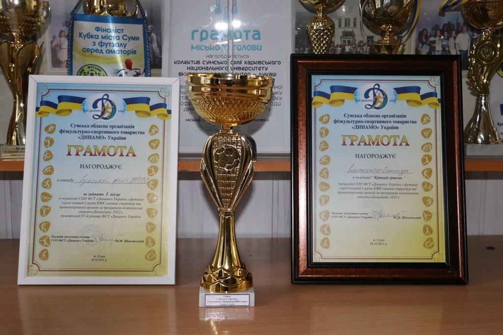 Ще 26 березня 2021 року команда Сумської філії ХНУВС, до складу якої увійшли викладачі СЦППП «Академія поліції» та курсанти філії, взяла участь у відбіркових іграх чемпіонату обласної організації ФСТ «Динамо» України з футзалу по І групі за програмою змагань «Динаміада – 2021». За результатами трьох матчів проти команд в/ч 2276 НГУ (м. Охтирка), УСБУ в Сумській області та Сумської обласної прокуратури наша команда вийшла у фінальну частину чемпіонату.