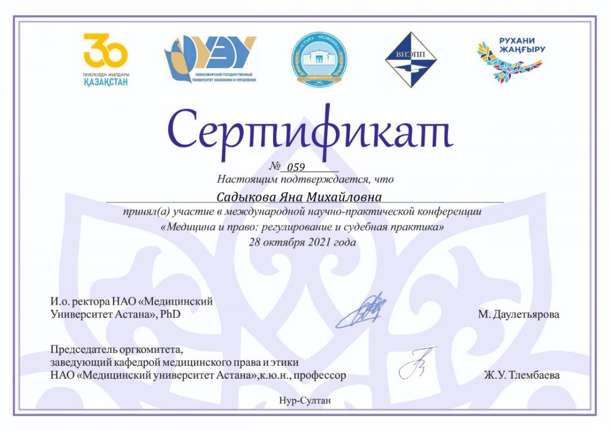 У форматі онлайн відбулася Міжнародна науково-практична конференція «Медицина та право: регулювання та судова практика» на базі Некомерційного акціонерного товариства «Медичний університет Астана», темою якої стали: «Нагальні проблеми захисту прав пацієнтів, якість медичних послуг, притягнення працівників медичних закладів до відповідальності тощо».
