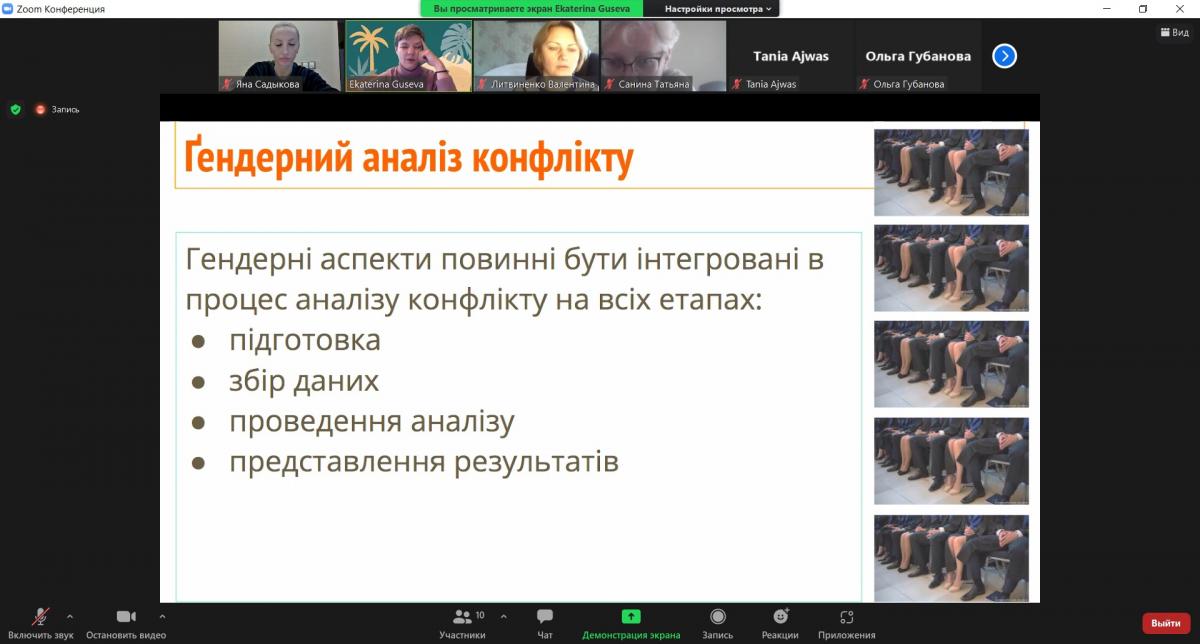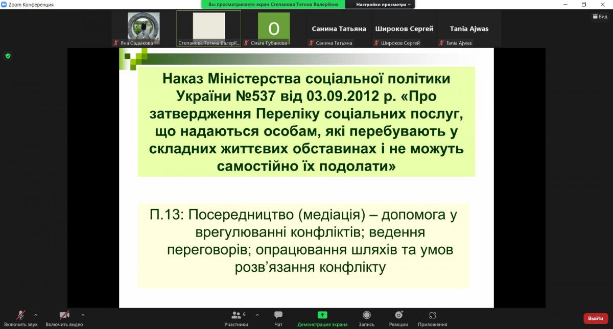 В процесі навчання розглядалися гендерні аспекти в медіації питання розвитку медіації в Україні; питання відновного правосуддя (соціально-філософські, культурологічні та психологічні аспекти проблеми злочину і покарання з точки зору різних парадигм); судова медіація: поняття, види, нормативне закріплення ті інші.