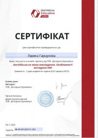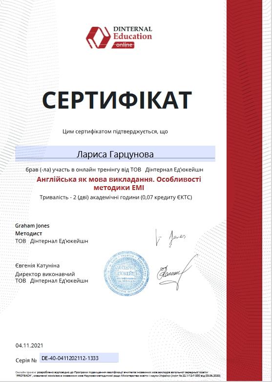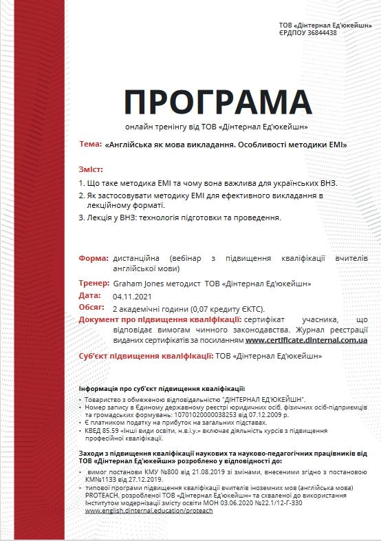 Старший викладач кафедри гуманітарних дисциплін Лариса Гарцунова взяла участь у тренінгу від ТОВ DINTERNAL EDUCATION на тему «Англійська як мова викладання. Особливості методики ЕМІ» (мова проведення – англійська).