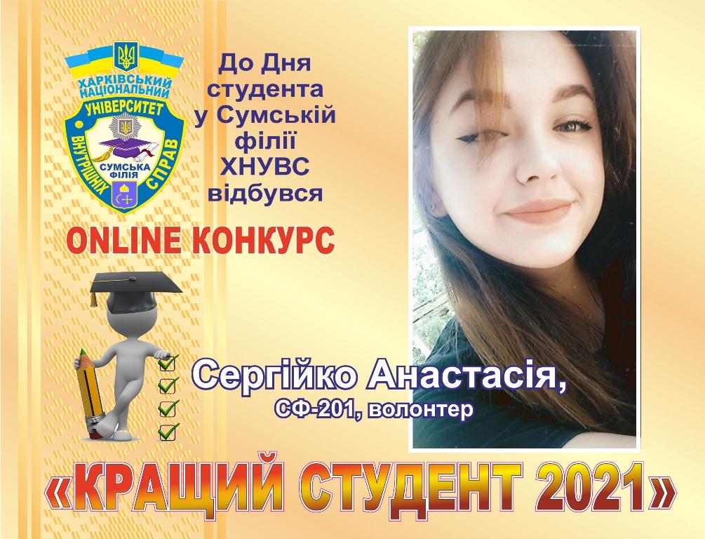 Кращий студент - волонтер - Сергійко Анастасія, СФ-201.