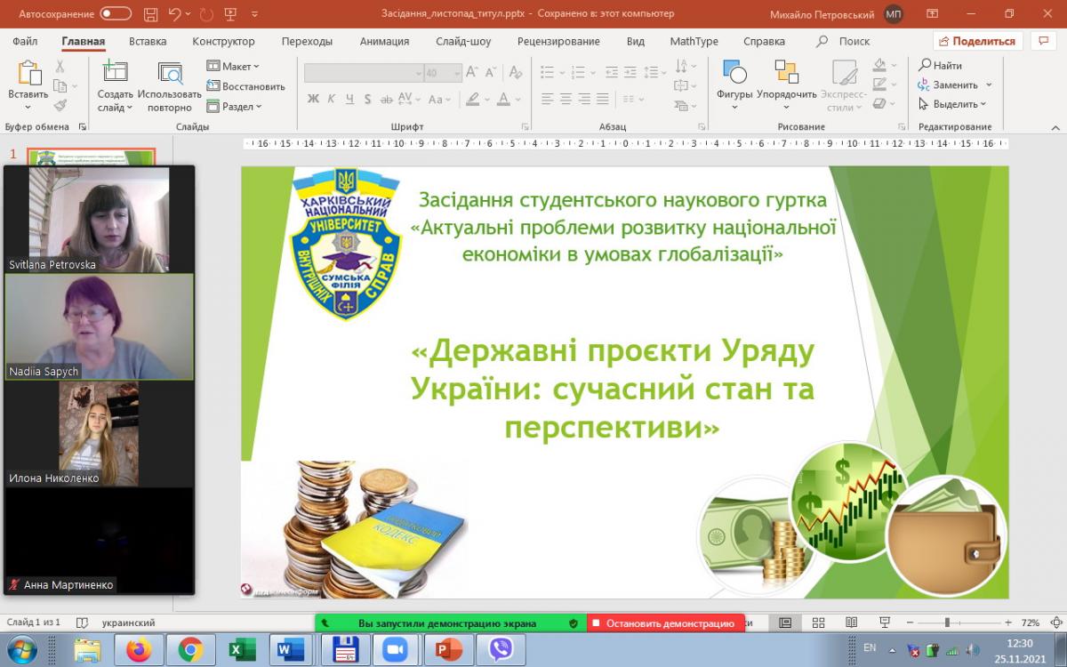Відповідно до плану роботи гуртка кафедри соціально-економічних дисциплін Сумської філії Харківського національного університету внутрішніх справ відбулося засідання на тему «Державні проєкти Уряду України: сучасний стан та перспективи», організатором якого стала доцент кафедри, канд.екон.наук, доцент Надія Сапич.