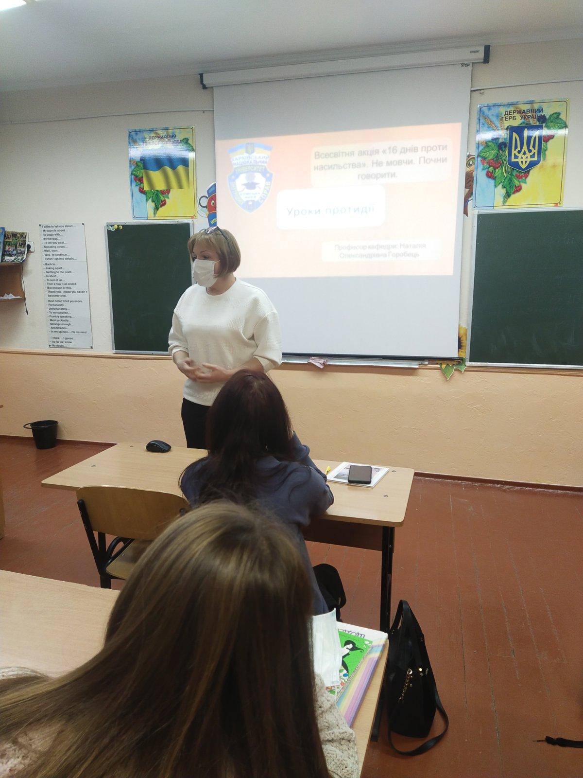 Професор кафедри юридичних дисциплін Сумської філії ХНУВС Наталія Горобець провела урок для учнів 10-б класу КУ ЗОШ І-ІІІ ст. №23 м. Суми на тему "Протидія насильству. Не мовчи. Почни говорити".