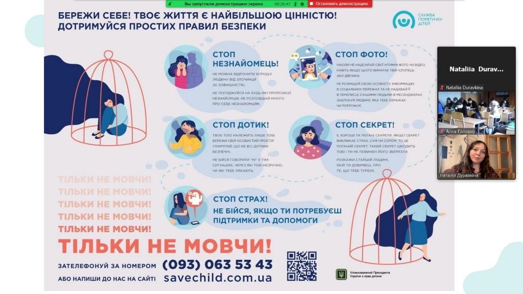 Лектор розповіла учням як сформувати поняття цінності їхнього життя, ознайомила їх з поняттям особистих кордонів. Також навчила учнів розрізняти небезпечні життєві ситуації та як застосовувати правила безпеки з метою захисту їхнього життя.