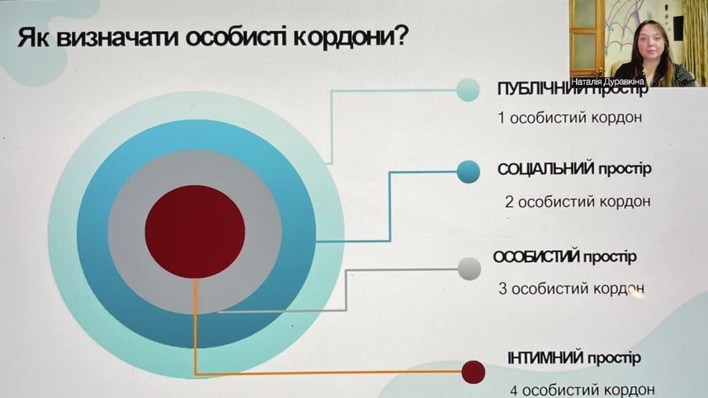 Під час уроку було обговорено, що таке особисті кордони, та які вони бувають: «публічний простір», «соціальний простір», «особистий простір», «інтимний простір». Було наголошено на основні правила безпеки кожного кордону.