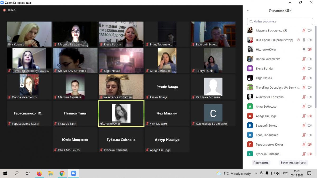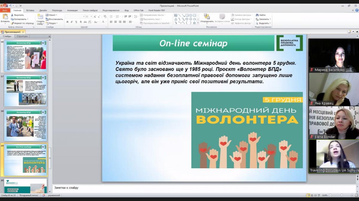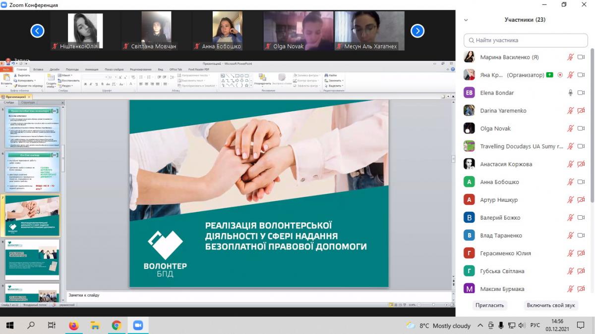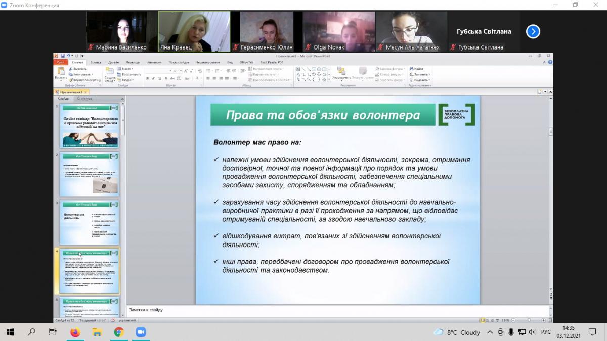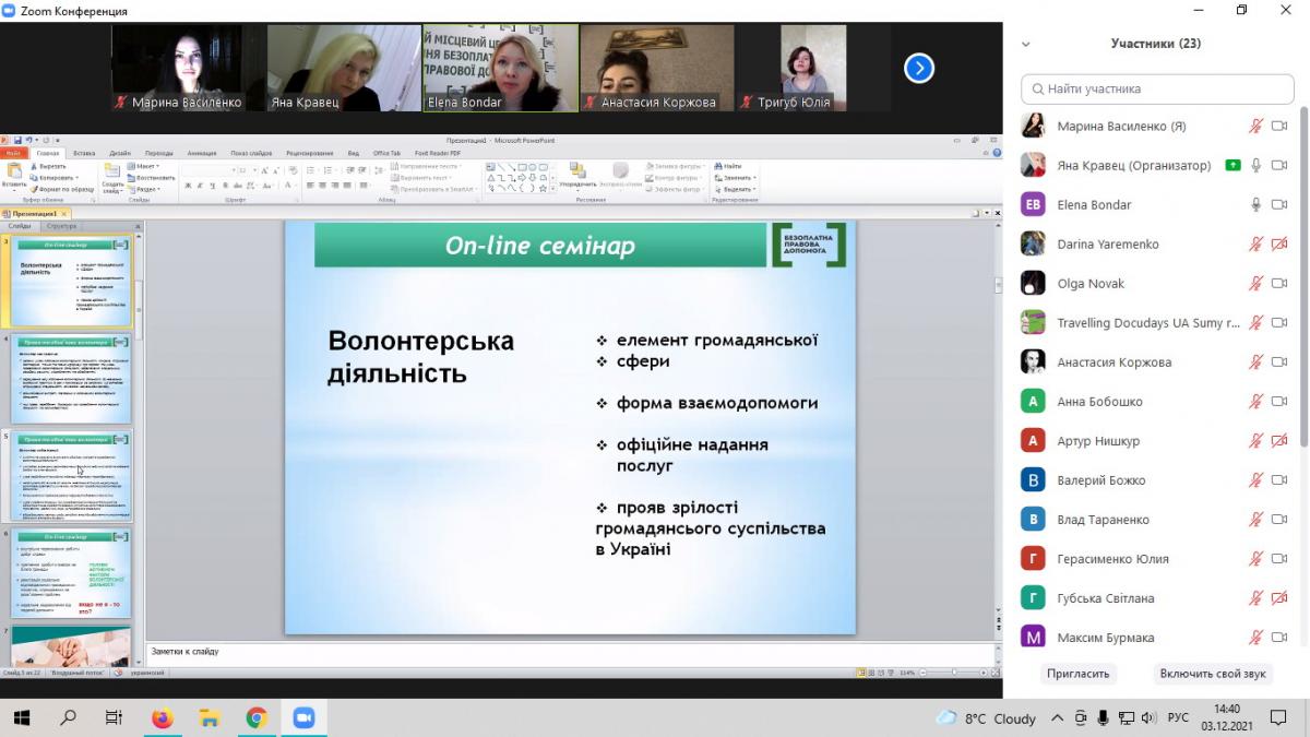 Студенти-правники Сумської філії ХНУВС разом із доцентом кафедри юридичних дисциплін Мариною Василенко, фахівцями Регіонального центру з надання безоплатної вторинної правової допомоги у Сумській області та Сумського місцевого центру, спільно із волонтеркою безоплатної правової допомоги Юлією Тарасенко-Баландіною стали учасниками онлайн-семінару «Волонтерство у сучасних умовах: виклики та відповіді» у межах дисципліни «Особливості практичного права».